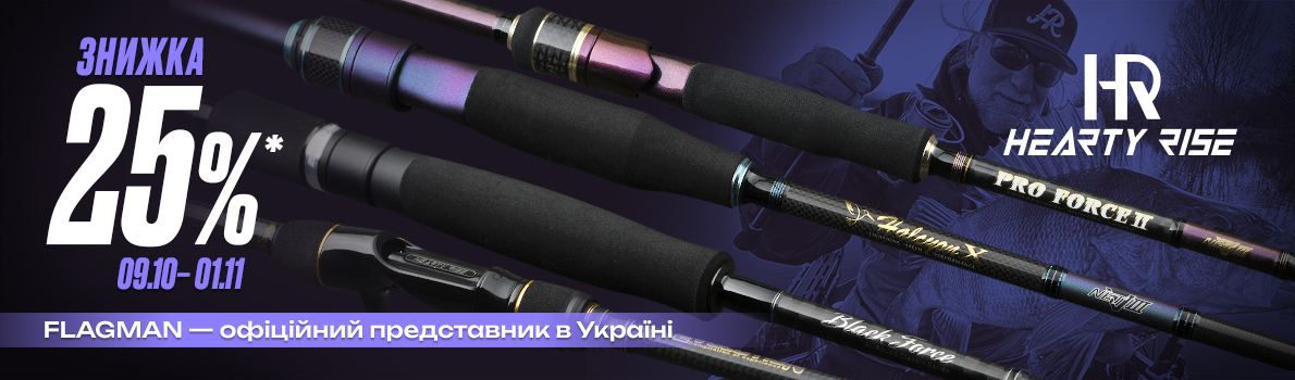 * З 9 жовтня до 1 листопада 2025 року в усіх магазинах мережі Flagman та в інтернет-магазині flagman.ua покупці мають право отримати знижку 25% на всі спінінгові вудлища бренду “Hearty Rise”. Знижка не додається до знижок за іншими акціями. Не поширюється на товари з обмеженою знижкою, спецпропозиції та подарункові сертифікати. Кількість і перелік акційних товарів обмежено. У разі, якщо акційний товар одночасно бере участь в іншій акції або рекламній пропозиції, чи на нього встановлено окрему знижку, то такі знижки не підсумовуються.