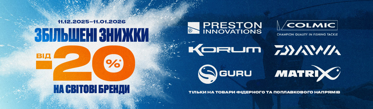 * У період з 11 грудня 2025 року до 11 січня 2026 року в усіх магазинах мережі Flagman та в інтернет-магазині flagman.ua з нагоди акції «Збільшені знижки на світові бренди» покупці мають право отримати знижку від 20% на товари для фідерної та поплавкової ловлі від провідних ТМ: “Daiwa”, “Preston”, “Korum”, “Guru”, “Colmic” та “Matrix”. Знижка не додається до знижок за іншими акціями. Не поширюється на товари з обмеженою знижкою, спецпропозиції та подарункові сертифікати. Кількість і перелік акційних товарів обмежено. У разі, якщо акційний товар одночасно бере участь в іншій акції або рекламній пропозиції, чи на нього встановлено окрему знижку, то такі знижки не підсумовуються.