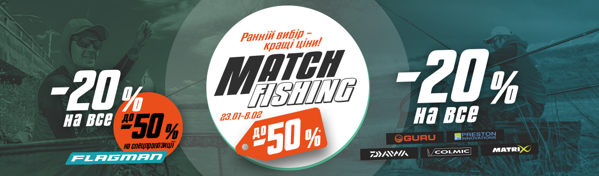 * У період з 23 січня до 8 лютого 2026 року в усіх магазинах мережі Flagman та в інтернет-магазині flagman.ua покупці мають право отримати знижку до 20% на всі товари для фідерної та поплавкової ловлі брендів “Flagman”, “Daiwa”, “Preston”, “Guru”, “Colmic” та “Matrix”, а також до 50% на спеціальні пропозиції від Flagman. Знижка не сумується з іншими акціями і не поширюється на товари з обмеженою знижкою, спецпропозиції та подарункові сертифікати. Кількість і перелік акційних товарів обмежено. У разі, якщо акційний товар одночасно бере участь в іншій акції або на нього встановлено окрему знижку, такі знижки не підсумовуються.