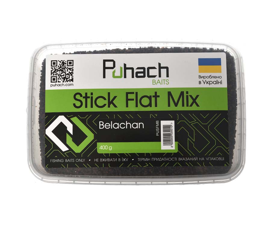 Puhach Stick Flat Mix – спеціальний прикормочний мікс від чемпіона України та відомого риболова-спортсмена Олексія Пугача, складений із кількох видів пелетсу преміум класу. Мікс призначено для фідерної ловлі з годівницями типу «метод», виготовлення ПВА-стіків або створення інших прикормочних сумішей. Гранули суміші Puhach Stick Flat Mix складаються з високоякісних натуральних інгредієнтів, що постачають із європейського ринку, та які мають високу харчову цінність для риби. Зволожений пелетс стає липким та важким. Він чудово формується в прес-формі, відмінно тримається в годівниці, добре тоне й залишається на дні поруч із насадкою, поширюючи у воді цінні поживні речовини та насичений аромат, що миттєво стимулює апетит риби та спонукає її до активного харчування. Пелетс Puhach Stick Flat Mix містить високий рівень натуральних атрактантів, які ефективно принаджують рибу будь-якої пори року. Цю серію можна використовувати як у фідерній, так і в коропової риболовлі.