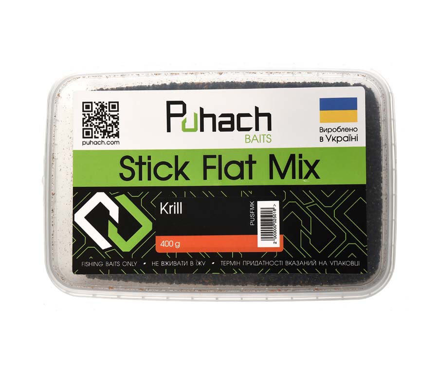 Puhach Stick Flat Mix – спеціальний прикормочний мікс від чемпіона України та відомого риболова-спортсмена Олексія Пугача, складений із кількох видів пелетсу преміум класу. Мікс призначено для фідерної ловлі з годівницями типу «метод», виготовлення ПВА-стіків або створення інших прикормочних сумішей. Гранули суміші Puhach Stick Flat Mix складаються з високоякісних натуральних інгредієнтів, що постачають із європейського ринку, та які мають високу харчову цінність для риби. Зволожений пелетс стає липким та важким. Він чудово формується в прес-формі, відмінно тримається в годівниці, добре тоне й залишається на дні поруч із насадкою, поширюючи у воді цінні поживні речовини та насичений аромат, що миттєво стимулює апетит риби та спонукає її до активного харчування. Пелетс Puhach Stick Flat Mix містить високий рівень натуральних атрактантів, які ефективно принаджують рибу будь-якої пори року. Цю серію можна використовувати як у фідерній, так і в коропової риболовлі.