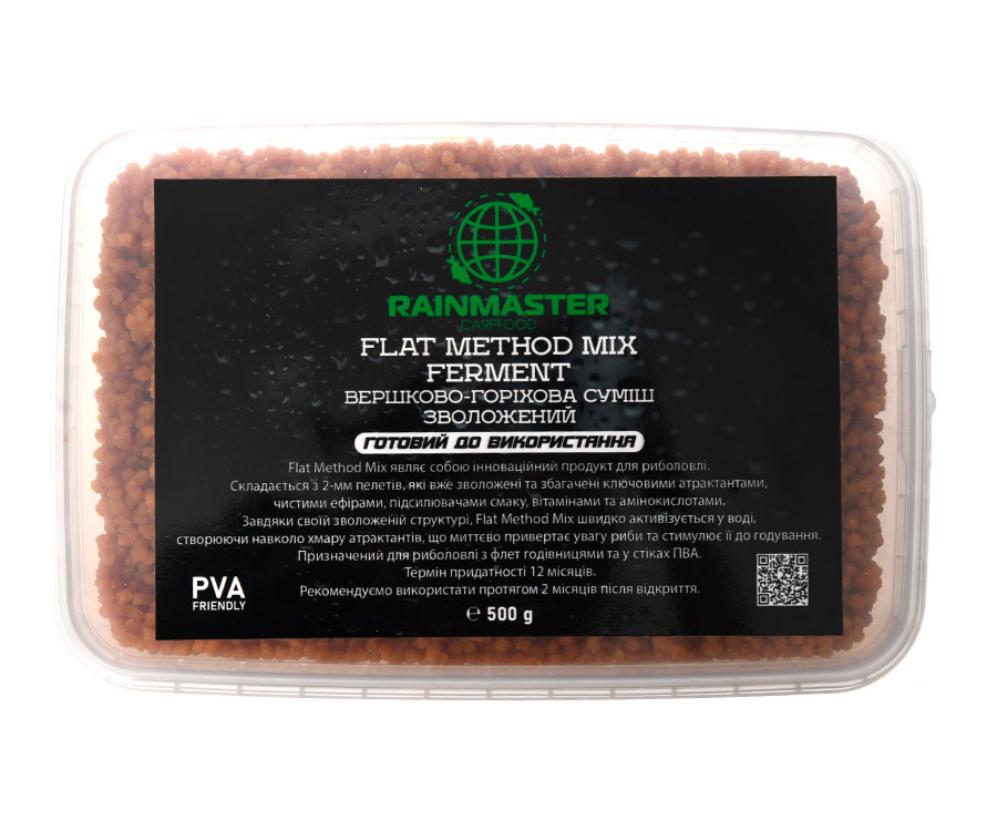 Rainmaster Flat Method Mix – спеціальні прикормочні суміші, які призначено для флет-фідерної ловлі з годівницями типу Method. Ці ефективні метод-мікси створено за унікальною рецептурою, отриманою впродовж багатьох років на великій кількості змагань із ловлі коропа за максимального пресингу на рибу. Прикормочні суміші Rainmaster Flat Method Mix виготовлено виключно з якісних натуральних інгредієнтів, які не шкодять навколишньому середовищу, мають високу харчову цінність для риби і припали їй до смаку. Зволожена суміш Flat Method Mix стає липкою та важкою. Ви можете додати пеллетс, подрібнені бойли та інші великофракційні компоненти без втрати липкості прикормки. Вона чудово формується в прес-формі, відмінно тримається в годівниці, добре тоне та залишається на дні поруч із насадкою, поширюючи у воді цінні поживні речовини та насичений аромат, що миттєво стимулює апетит риби та спонукає її до активного харчування. Упаковка: 400 г.
