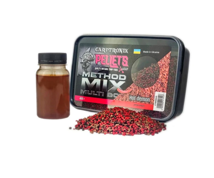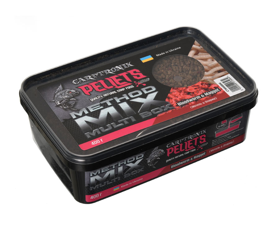 Carptronik Method Mix Multi Box – серія преміальних прикормочних міксів, які призначено для метод-фідерної ловлі. Гранули суміші Carptronik Method Mix Multi Box складаються з високоякісних натуральних інгредієнтів і мають високу привабливість та харчову цінність для риби. У комплекті із 400 г суміші пелетсів Carptronik Method Mix постачається 100 мл ліквіду для замішування прикормки. Зволожений ліквідом пелетс чудово формується в прес-формі, відмінно тримається в годівниці. Він добре тоне та залишається на дні поруч із насадкою, поширюючи у воді цінні поживні речовини та насичений аромат, у надзвичайний спосіб стимулюючи апетит риби. Робоча суміш Carptronik Method Mix Multi Box містить високий рівень натуральних атрактантів і стимуляторів клювання, які ефективно приваблюють рибу в будь-яку пору року. Продукцію можна застосовувати як у фідерній, так і в короповій риболовлі.