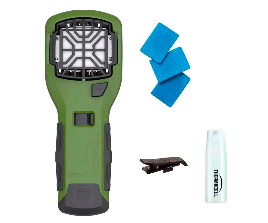 Пристрій від комарів Thermacell Portable Mosquito Repeller MR-350 – сучасний прилад, що забезпечує захист риболовів, мисливців, туристів, відпочиваючих на природі людей від комарів і інших комах на площі до 20 квадратних метрів та поширює репелент за принципом фумігації. Для роботи фумігатора необхідно встановити газовий картридж, який фіксується в руків’ї, і пластину з репелентом. Після вмикання приладу, пластина, просочена аналогом природного інсектициду Алетрин, нагрівається, поширюючи захисну речовину навколо користувача. Кожен балончик із газом працює до 12 годин, пластинка з репелентом – до 4 годин. Ви можете використовувати прилад і менший час, наприклад, 1 годину на день. Якщо періоди використання перевищують 7 днів, то балончик і пластину необхідно вийняти з приладу, і зберігати в сухому темному місці до наступного використання.