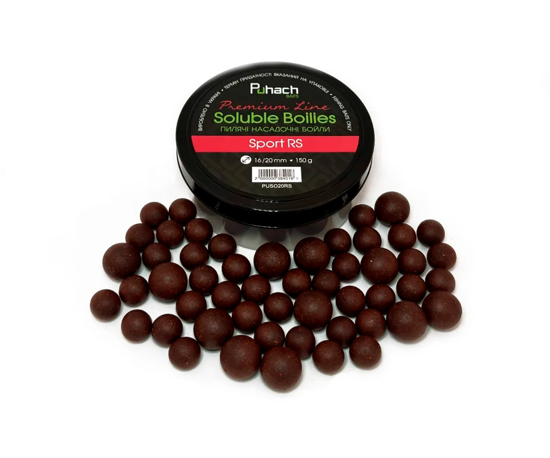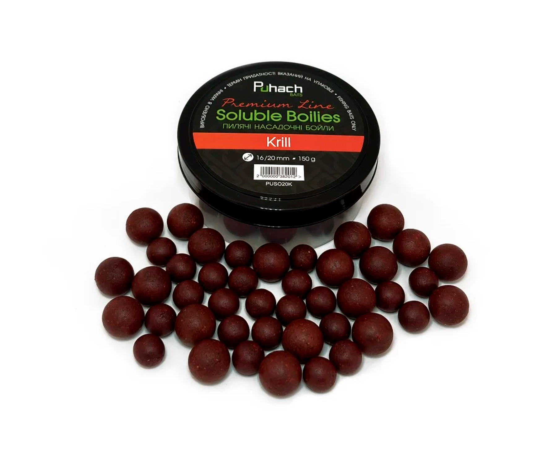 Puhach Baits Premium Line Soluble Boilies – насадочні пилячі бойли найвищої якості для ловлі великої риби. Розроблені чемпіоном України та відомим риболовом-спортсменом Олексієм Пугачем з урахуванням досвіду українських і міжнародних змагань. Випускаються у двох комбінаціях розмірів: 14 мм та 20 мм. У герметичній баночці 150 г продукту. Бойли Puhach Baits Premium Line Soluble підходять для ловлі як вдень, так і вночі. Не розвалюються під час насаджування за допомогою товстої голки. Ідеальні для ловлі коропа, амура та іншої великої риби. Приманки виготовлено з використанням високоякісних інгредієнтів, що постачають із європейського ринку: зернових, стимуляторів апетиту, ароматизаторів, підсолоджувачів, харчових барвників і бетаїну. У серії присутні класичні та фруктові запахи, солодкі аромати і спеції, особливо привабливі для трофейної риби. Бойли Puhach Premium Line Soluble Boilies абсолютно нешкідливі для риби та інших підводних мешканців. Їх випускають з оригінальним кольором, смаком і запахом, що швидко поширюється у воді та чудово приваблює рибу в місце ловлі. Рекомендовано як для класичної коропової, так і для флет-фідерної ловлі.