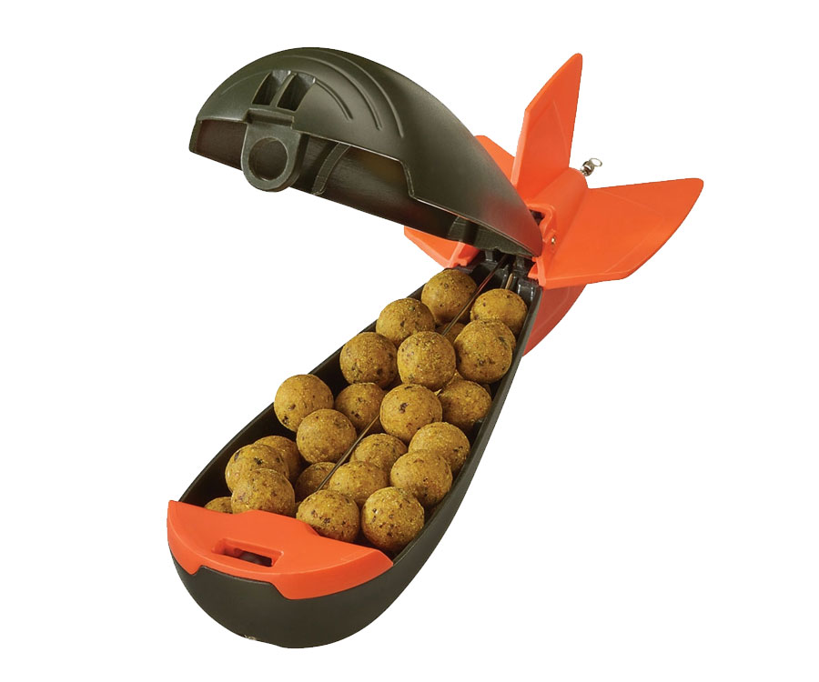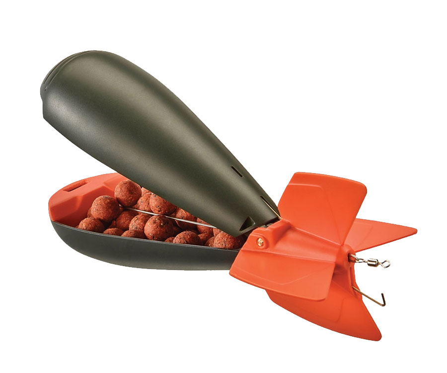 TF Gear Airbomb Shotgun Baiting – прикормочна ракета, яка має унікальну властивість розкриватися у повітрі над місцем підгодовування. Принцип її роботи полягає у наступному: коли ви закидаєте ракету на певну дистанцію (обмежив сходження шнура кліпсою), ракета долітає до місця призначення, шнур натягується, через що спрацьовує механізм розкриття Airbomb Shotgun Baiting у повітрі над місцем підгодовування. Таким чином, прикормку буде розкидано навколо вашої приманки без гучного ляпання, а спустошену ракету не потрібно витягувати з глибини, розлякуючи рибу. Ще одна унікальна особливість: ракету можна закинути далі потрібного місця, а потім потихеньку підтягнути до місця, яке підгодовуємо, і смикнути, щоб ракета розкрилася.