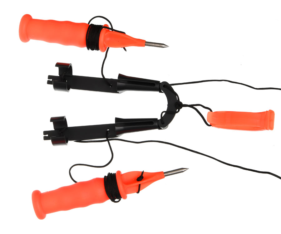 Надійні зачепи (рятувалки) – запорука вашої безпеки на кризі. Рятувалки Flagman виготовлено з міцного пластику, оснащено металевими шипами з гострими вістрями та свистком. Виріб вішають на шию. Упродовж риболовлі він вісить на грудях риболова в складеному стані. У разі, коли рибалка провалився під кригу, слід спокійно розчохлити зачепи, міцно взяти їх до рук та, встромлюючи вістрями в кригу попереду себе й підтягуючись, виповзти на міцну ділянку криги. Задля безпеки вістря сховано в захисні ковпачки.