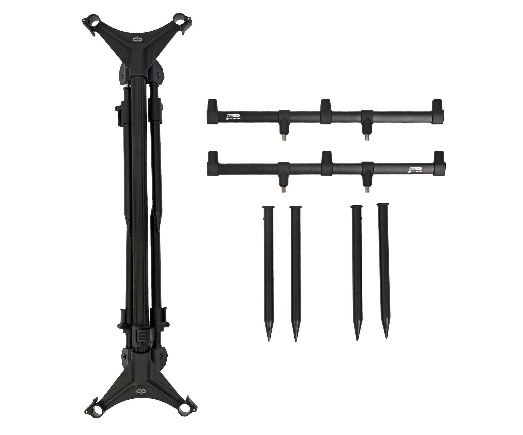 Carp Pro СP57040B – компактний род-под на три вудлища. Раму та ноги виконано з алюмінію, вони мають телескопічну конструкцію. Буз-бари Carp Pro СP57040B оснащено окремими загостреними ногами, завдяки яким на м'якому ґрунті їх можна використовувати окремо – без станини.