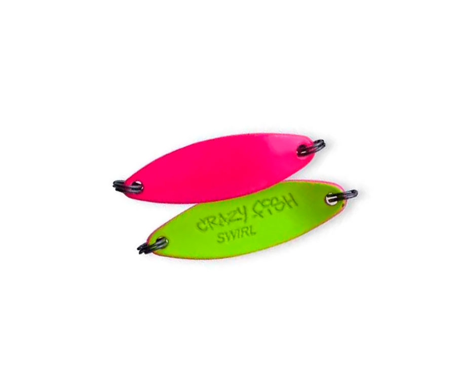 Crazy Fish Swirl — вытянутой формы блесна, напоминающая ивовый листок. Предназначена для ловли на течении голавля, жереха, язя и форели, поэтому сделана из довольно толстого металла. Отлично летит даже при сильном боковом ветре благодаря своей форме и относительно большому весу при малом размере.