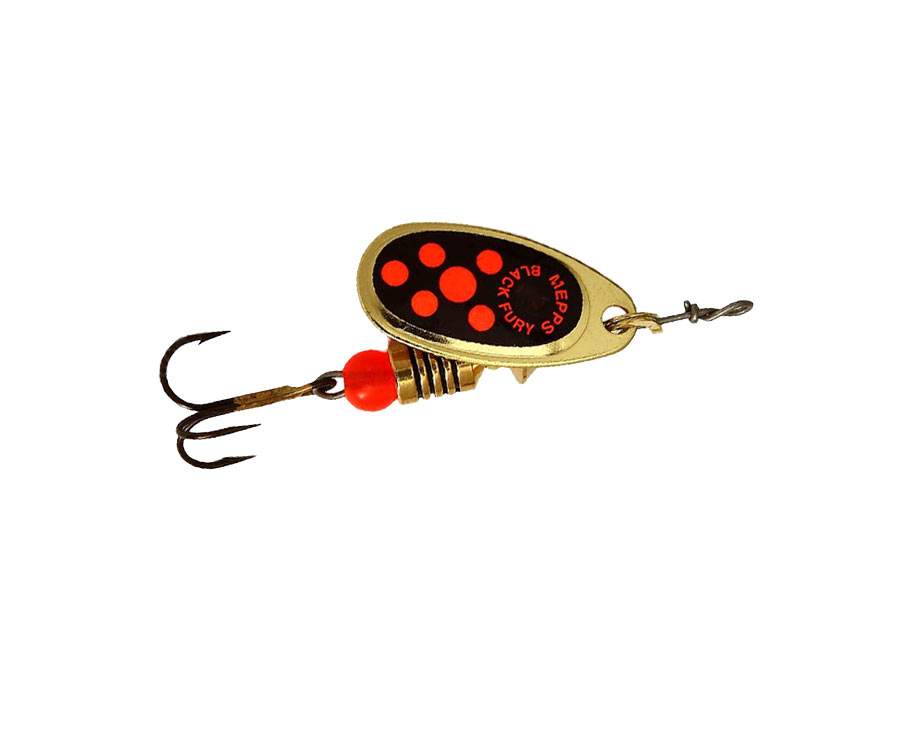 Блесна Mepps Black Fury не только подходит для ловли большинства видов рыб, но и в целом ряде случаев не имеет себе равных. Все разновидности оснащаются лепестками серебряного, золотого, медного и черного цветов. Между собой они различаются по окраске точек на черном фоне наклеек, расположенных с внешней стороны лепестков. При вращении лепестка, благодаря цветным точкам наклеек и ее черной подложке, приманка напоминает крупное насекомое. Поскольку блесны оснащаются лепестками различных цветов, то всегда есть возможность выбора наиболее удачного сочетания. В одном случае, предпочтительней окажется яркая окраска, контрастирующая с окружающим фоном, в другом — маскирующая (такой вариант очень эффективен при охоте на осторожную рыбу). Иногда бывает, что к успеху приводит чисто механический подбор цвета приманки, поскольку нет никаких видимых оснований для конкретного выбора. Часто в информационном материале MEPPS обращает внимание рыболовов на сходство окраски вращающихся блесен и насекомых, мелких рыбешек. Весьма приблизительной имитацией рыбки, из вращающихся блесен, может служить лишь AGLIA LONGUE. В основном, это достоинство воблеров и колеблющихся блесен. Дело в том, что не только мирные, но и хищные рыбы в раннем периоде своего развития проходят насекомоядную стадию. Естественно, что рефлекторная память сохраняется очень долго, этим, вероятно, и объясняются феноменальные способности Black Fury. Эти расцветки — очень богатые украшения блесен, воссоздающие визуальные стимулы наиболее привычных жертв: сверчков, кузнечиков, лягушек, водных и земных личинок, гольянов в брачных окрасках. Угол вращения 45°. Средняя скорость вращения лепестка. Быстрая, но различимая вибрация и прерывистость визуального сигнала.