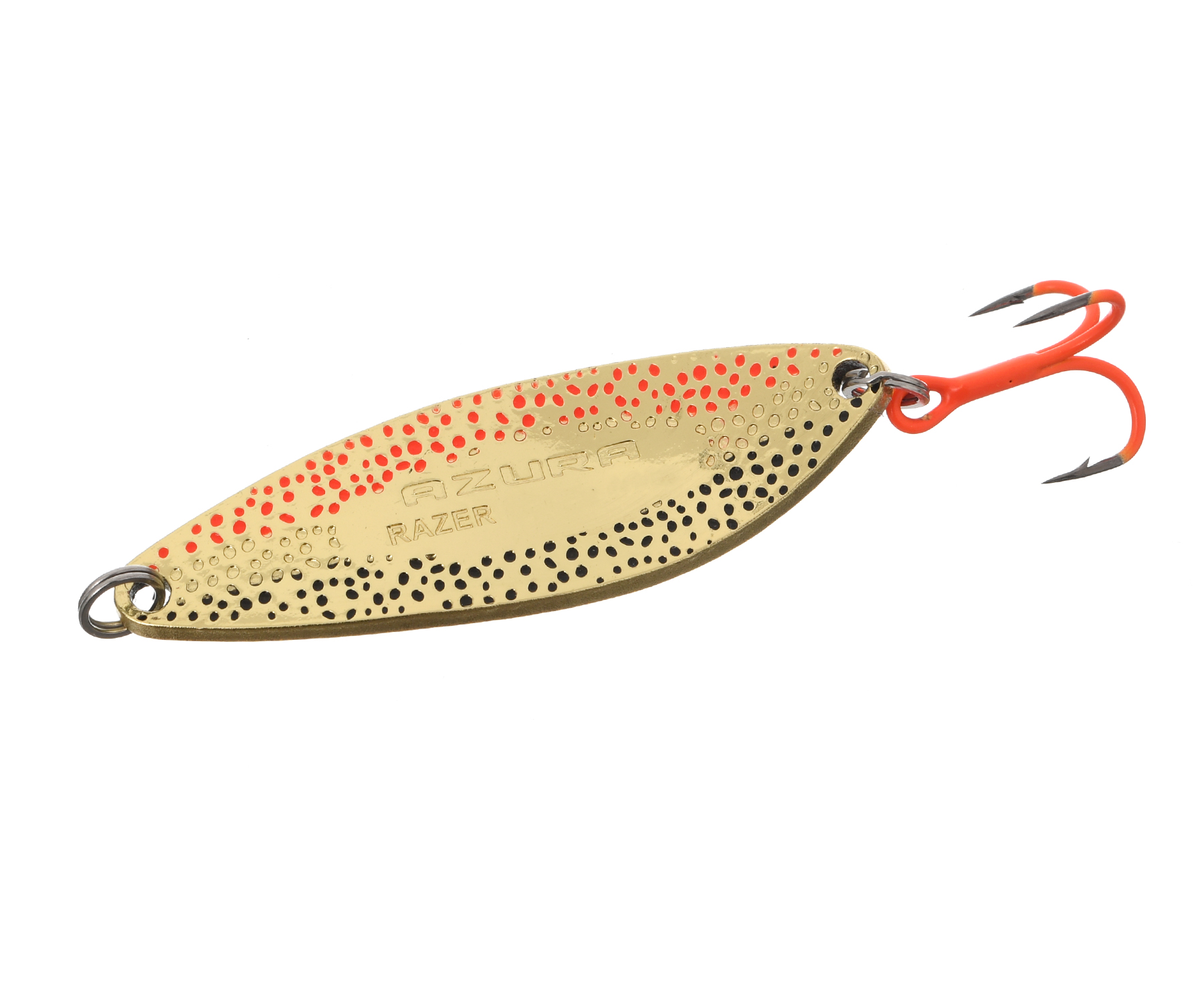Блесны Azura Razer – серия высококлассных колеблющихся блесен удлинённой зауженной формы, изготовленных из латуни. Благодаря своей форме и уникальному профилю блесна Azura Razer обладает достаточно активной компактной игрой, при которой в основном работает её задняя часть, создавая мощные низкочастотные колебания, привлекательные для любого хищника. Блесна создавалась для ловли на быстрых реках, поэтому прекрасно держит течение, не всплывает на поверхность и отличается высокой стабильностью игры. В то же время заливы рек, озера, протоки и водохранилища без течения также являются вотчиной этой приманки, собирающей и здесь богатую дань! Приманка отлично сбалансирована, отлично держит глубину проводки и обладает невероятными аэродинамическими характеристиками, позволяющими выполнять дальние и сверхдальние забросы, т.е. не только работать по площадям, но и доставать до самой осторожной рыбы. Специфическая рельефная внешняя поверхность блесны не только делает привлекательным её внешний вид, но и создаёт во время проводки мерцающие блики и микрозавихрения воды, вызывающие у хищных рыб оживлённый интерес и провоцирующие их на мгновенную атаку. Блесна очень универсальна и показывает феноменальные результаты уловистости как на медленных и средних, так и на высоких скоростях проводки. В списке её трофеев щука, окунь, жерех, голавль, судак, лосось и прочие хищники. Колебалки Azura Razer – прекрасный пример объединения проверенной временем японской классики и современных технологий. Приманки оснащены надёжными заводными кольцами и острейшими тройниками, доступны в широком спектре уловистых окрасок, в длине 54, 58, 62 мм и развесовке 14, 16, 21 г соответственно.