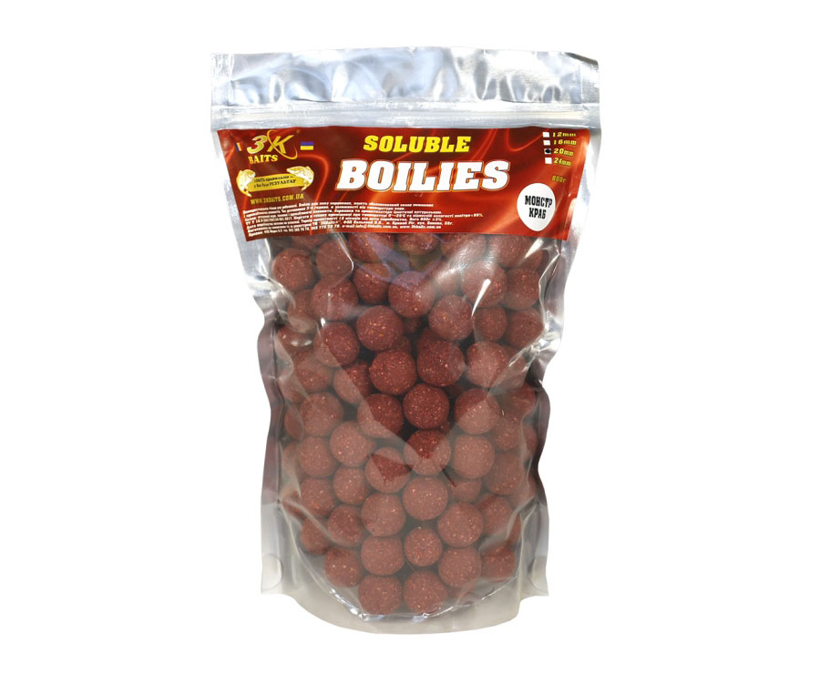 Растворимые пылящие бойлы 3KBaits – эффективные высококачественные приманки, которые специально разработаны для ловли карповых рыб. В своем составе бойлы 3KBaits имеют сбалансированный состав питательных и привлекающих рыбу элементов. Попадая в воду, приманка начинает пылить – выделять привлекающие и питательные вещества – и постепенно растворяться, образуя вокруг себя облако легкого тумана, привлекающее рыбу. Время полного растворения пылящего бойла 3KBaits, в зависимости от температуры воды, составляет около 4 часов. Бойлы ТМ 3KBaits прошли длительные испытания на водоемах Украины, и зарекомендовали себя, как очень эффективные приманки для крупной рыбы. Упаковка: zip-пакет 0,8 кг.