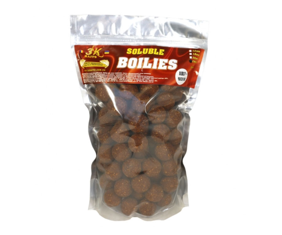 Растворимые пылящие бойлы 3KBaits – эффективные высококачественные приманки, которые специально разработаны для ловли карповых рыб. В своем составе бойлы 3KBaits имеют сбалансированный состав питательных и привлекающих рыбу элементов. Попадая в воду, приманка начинает пылить – выделять привлекающие и питательные вещества – и постепенно растворяться, образуя вокруг себя облако легкого тумана, привлекающее рыбу. Время полного растворения пылящего бойла 3KBaits, в зависимости от температуры воды, составляет около 4 часов. Бойлы ТМ 3KBaits прошли длительные испытания на водоемах Украины, и зарекомендовали себя, как очень эффективные приманки для крупной рыбы. Упаковка: zip-пакет 0,8 кг.
