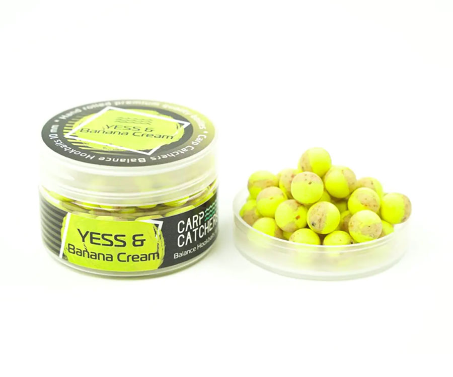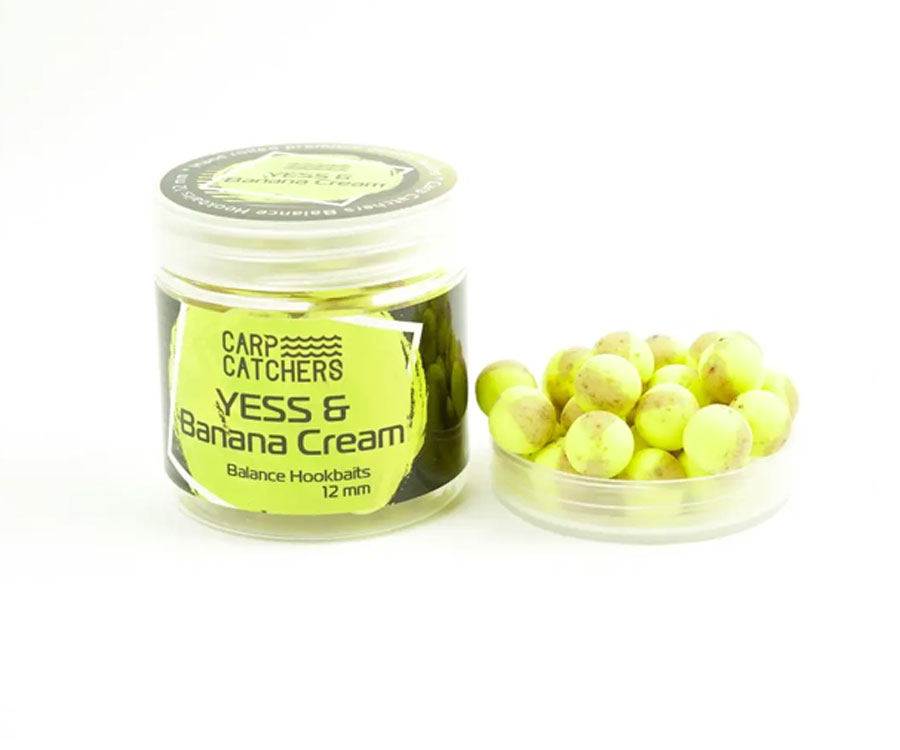 Carp Catchers Balance Hookbaits Yess&Banana Cream – насадочные бойлы баланс, которые являются плавающей приманкой и состоят из 2 частей варёного тонущего и 2 частей плавающего бойла. Balance Hookbaits YESS Banana Cream – сочетание насадочного донного бойла YESS и флюоресцентно-жёлтого поп-апа Banana Cream. Насадка имеет комбинированный флюоресцентно-жёлтый/натуральный жёлто-бежевый цвет. Бойлы YESS изготовлены на основе муки из различных орехов, молочных протеинов и имеют смешанный сливочно-ореховый вкус. Плавающий Banana Cream – это сладкий поп-ап с ароматом банана и сливок.