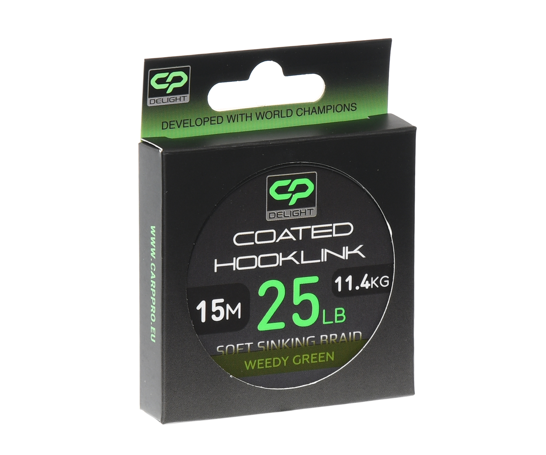 Carp Pro Deligth Soft Coated Hooklink – быстротонущий суперпрочный поводковый материал в оболочке. Его сердцевина обладает высокой мягкостью, а оболочка достаточной жёсткостью для изготовления специальных карповых монтажей устойчивых к абразиву. Предназначен для ловли на любом типе дна. Идеально подходит для классической карповой ловли. Материал имеет цвет Weedy Green (болотисто-зелёный), который отлично маскирует его на дне водоёма. В зависимости от модели имеет разрывную нагрузку 15 и 25 Lb. Поводковый материал Carp Pro Deligth Soft Coated Hooklink поставляется в размотке 15 м.