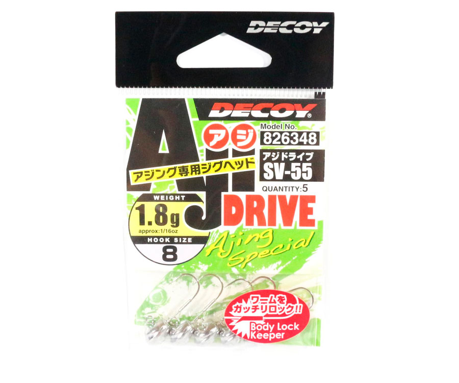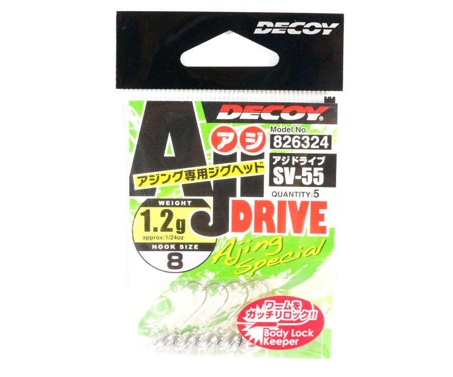 Джиг головка Decoy SV-55 Aji Drive – серия небольших джиг-головок, которые созданы специально для ловли ставриды. В условиях пресноводной рыбалки они отлично подойдут для охоты за окунем и форелью. Decoy SV-55 Aji Drive имеет слегка вытянутую и угловатую форму, благодаря которой прекрасно проходит через камни, в отличие от своих округлых аналогов. Джиг-головка Decoy SV-55 оборудована небольшим силиконовым фиксатором на цевье крючка, который отлично удерживает приманку от сползания даже после активных поклёвок. Груз-головка Decoy SV-55 Aji имеет невероятно острый крючок. Он способен эффективно пробивать даже довольно твёрдую пасть ставриды, не говоря уже о наших пресноводных рыбах.