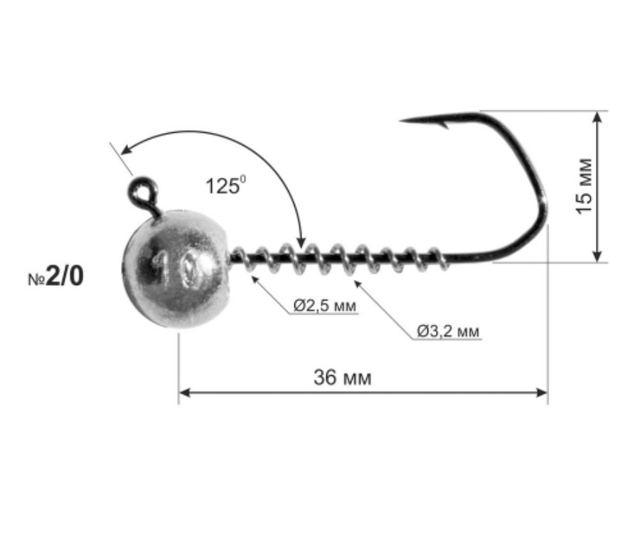 Джиг-головка Днипро-Свинец 125° Barbarian №2/0 с пружиной и крючком Barbarian. Крючок выполнен из высокоуглеродистой стали, произведенной в Бельгии (сталь используется в производстве крючков Owner). Основным фиксирующим элементом является витая пружина. Уникальность конструкции заключается в динамически изменяющемся диаметре пружины. Грузило шаровидной формы выполнено из качественного свинца марки С1. Ушко крючка загнуто под углом 125°, что придает более плавную и естественную проводку джиг-головке при отрыве от дна и опускании ее обратно. Также угол 125° позволяет подсекать и удерживать рыбу более эффективно. Крючок имеет высококачественное покрытие черный хром, позволяющее использовать крючок при ловле в морских лиманах.