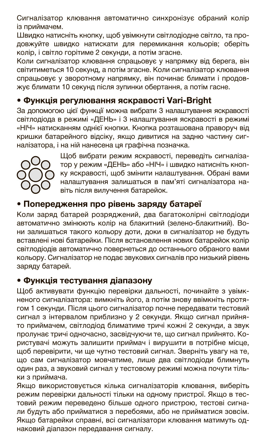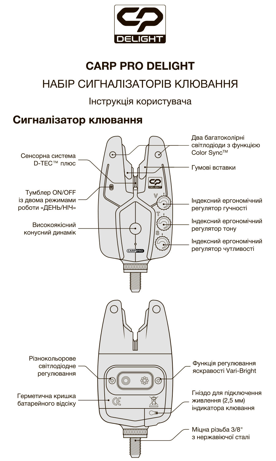 На задней панели сигнализатора поклёвки расположен герметичный отсек для элементов питания, крышка которого плотно крепится к корпусу 2 винтами, гнездо (2,5 мм) с резиновой заглушкой – для подключения питания механического индикатора поклёвки, а также 2 кнопки, при помощи которых осуществляются выбор цвета светодиодов и регулировка яркости Vari-Bright в дневном и ночном режимах. Два многоцветных светодиода-индикатора с функцией Color Sync расположены на передней панели. Они очень яркие и отлично видны как ночью, так и днём, при максимальном уровне яркости. Также доступны функции синхронизации, тестирования диапазона и предупреждения о низком уровне заряда элементов питания. Сигнализатор обладает функцией памяти для запоминания всех текущих настроек – чтобы не настраивать его «с нуля» на следующей рыбалке. Отличительной особенностью сигнализатора Delight является глубокий объёмный звук, который, несомненно, понравится многим карпятникам. Возможные варианты выбора цвета сигнализатора Carp Pro Delight: красный, зелёный, синий, жёлтый, пурпурный, белый. Его можно без проблем подключить к ресиверу из наборов CP Delight 2+1 и 4+1.