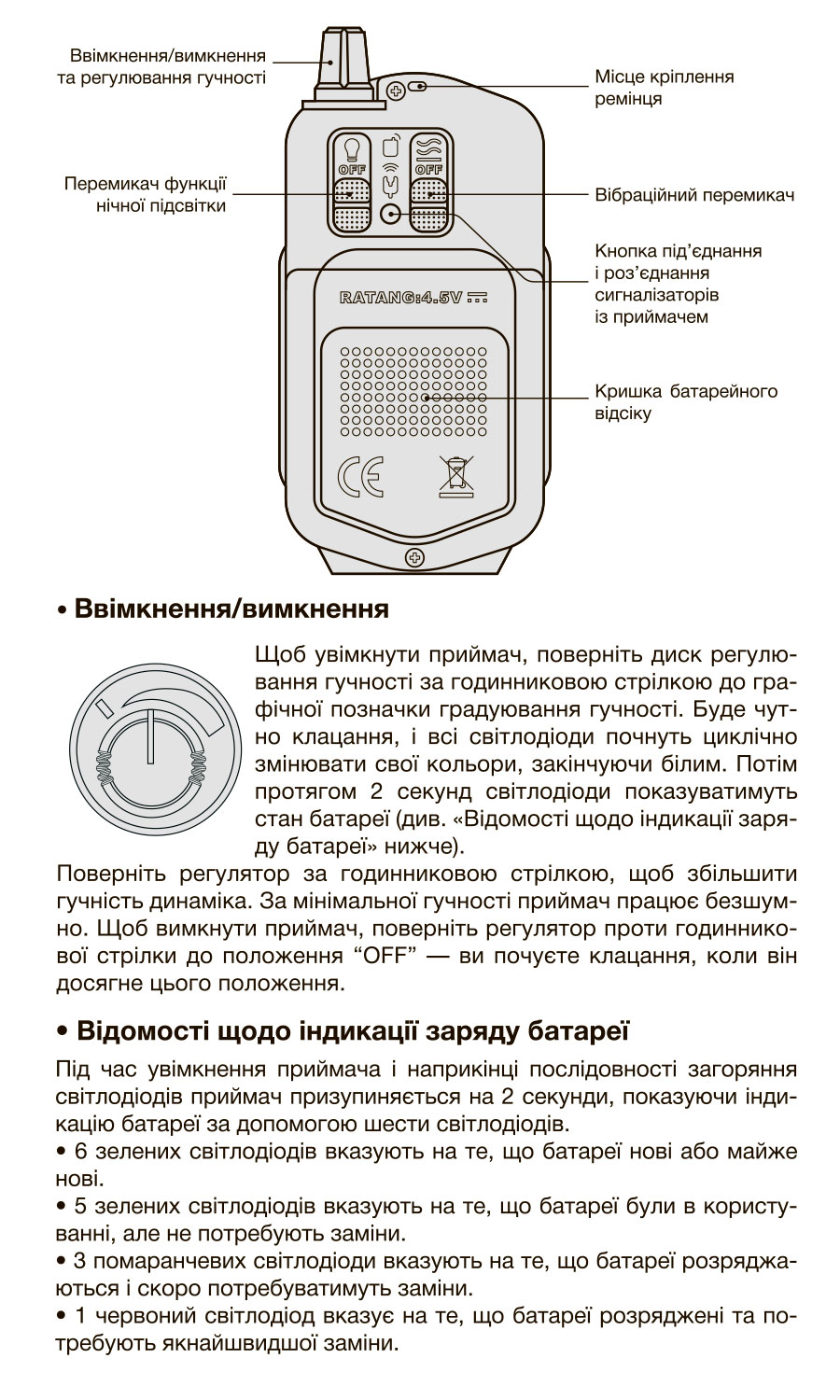Включение/выключение сигнализатора осуществляется при помощи тумблера на передней панели. Предусмотрено 3 положения тумблера: «Выключен», «Вкл. День», «Вкл. Ночь». Изделие имеет три колёсика-регулятора, которые обеспечивают настройку 8 уровней громкости, 8 режимов тональности и 8 уровней чувствительности.
