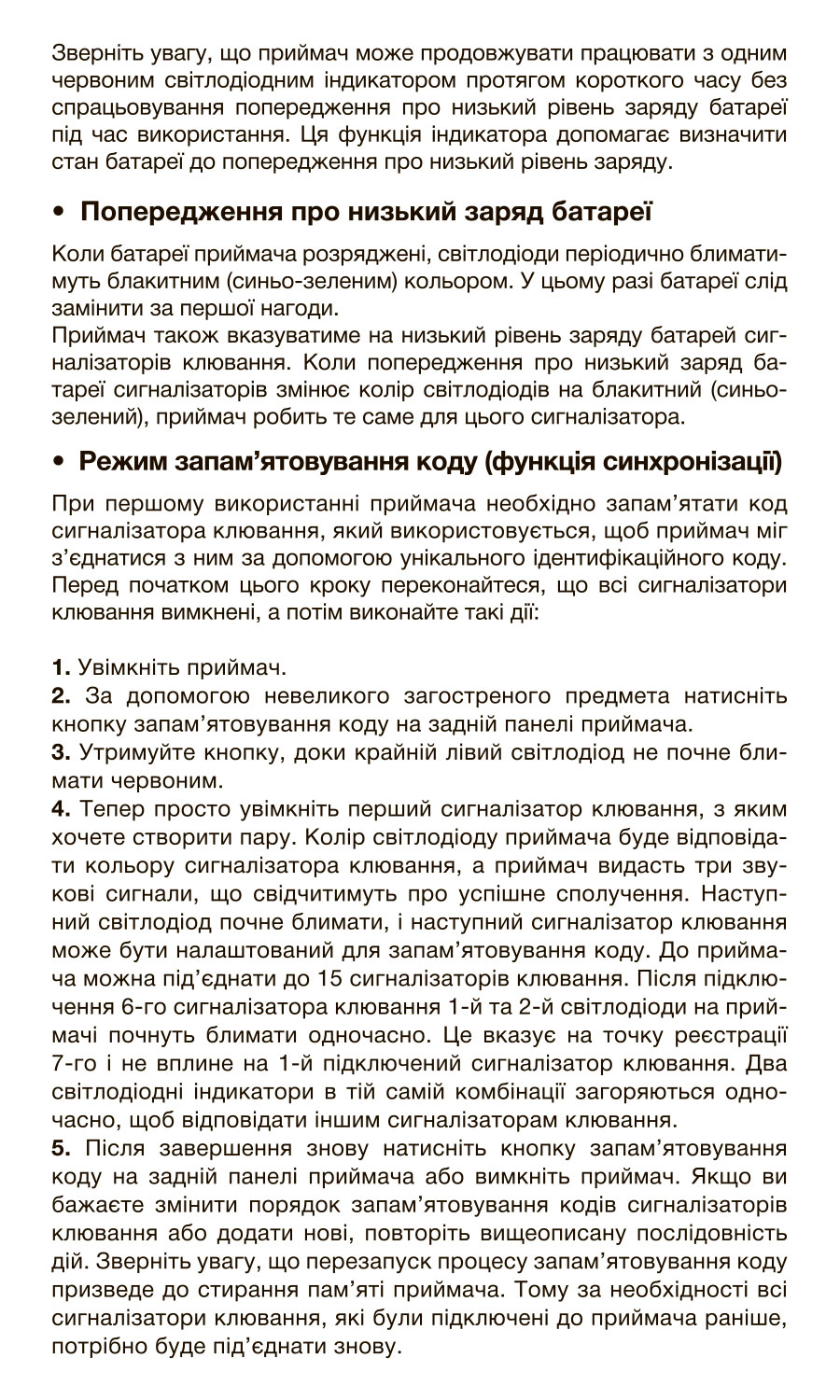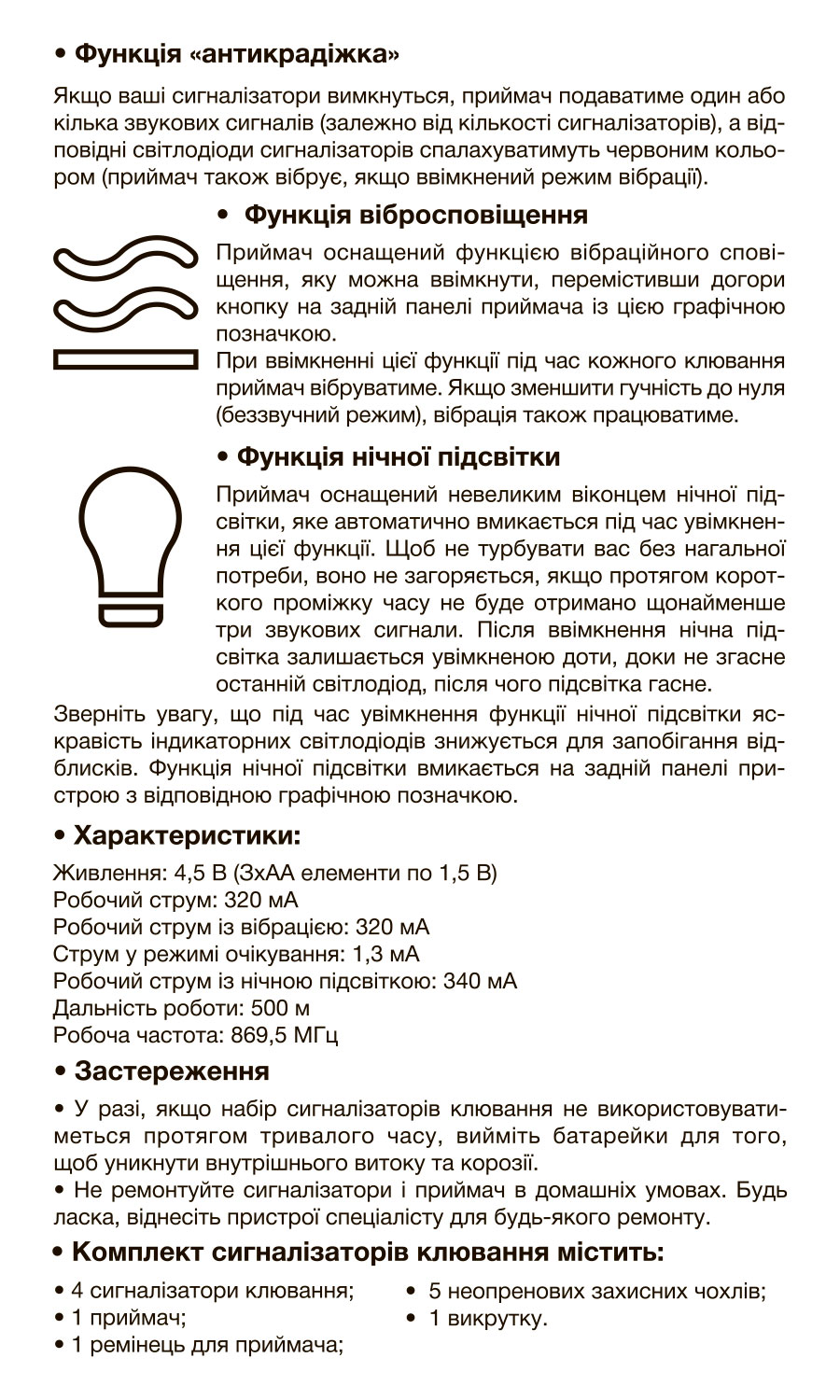 Питание сигнализатора осуществляется от 2 элементов AA (1,5 V). Частота сигнала: 869,5 МГц. Максимальная мощность передачи: 4 мВт. Класс защиты: IPX5.
