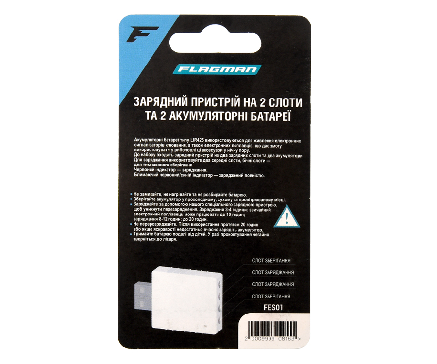 Flagman Electronic Set (Charger + 2 Rechargeable Batteries LIR425) FES01 – электронный набор из зарядного устройства и 2 аккумуляторных батарей LIR425 3,6В. Миниатюрные аккумуляторы LIR425 применяются для питания электронных сигнализаторов поклёвки, светодиодных поплавков и LED-светлячков, что позволяет использовать данные аксессуары в ночное время. Набор состоит из USB зарядного устройства с двумя зарядными слотами и двух аккумуляторов. Для зарядки используют два средних слота, боковые слоты предназначены для временного хранения аккумуляторов. Зарядку можно осуществлять от сетевого адаптера мобильного телефона, компьютера, ноутбука, повербанка, используя соответствующий USB разъем. Время полной зарядки от 3 до 12 часов – в зависимости от степени разрядки аккумулятора.