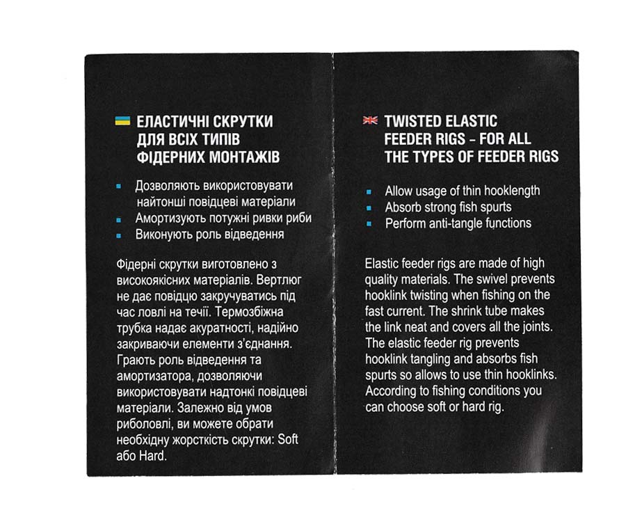 Flagman Elastic Feeder Rigs – эластичные фидерные скрутки для всех видов фидерных монтажей, изготовленные из высококачественных материалов. Вертлюг не позволяет поводку перекручиваться при ловле на течении. Термоусадочная трубка придаёт аккуратности, надёжно закрывая элементы соединения. Elastic Feeder Rigs играет роль отвода и амортизатора, что позволяет использовать сверхтонкие поводковые материалы. В зависимости от условий ловли, вы можете выбрать необходимую длину и жёсткость скрутки: Soft или Hard.