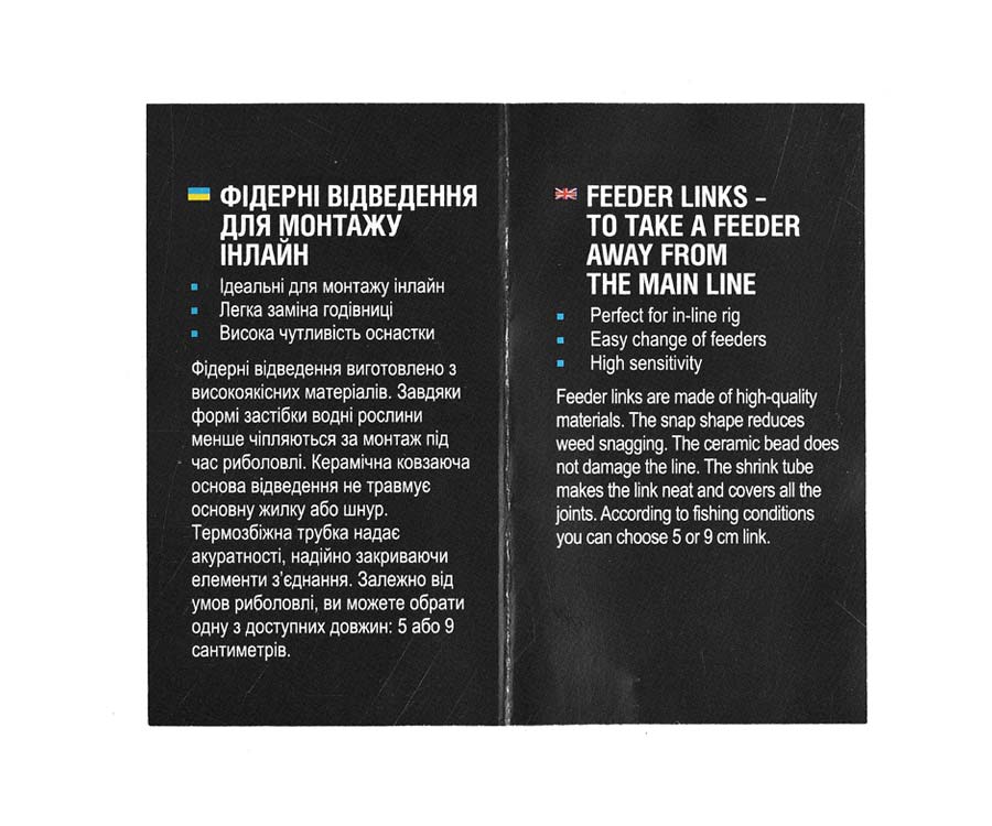 Фидерные отводы для монтажа инлайн Flagman Feeder Links изготовлены из высококачественных материалов. Благодаря форме застёжки водная растительность меньше цепляется за монтаж во время рыбалки. Керамическое скользящее основание отвода не повреждает основную леску или шнур. Термоусадочная трубка придаёт монтажу аккуратности, надёжно закрывая элементы соединения. В зависимости от условий ловли вы можете выбрать одну из доступных длин Flagman Feeder Links: 6 или 9 сантиметров.