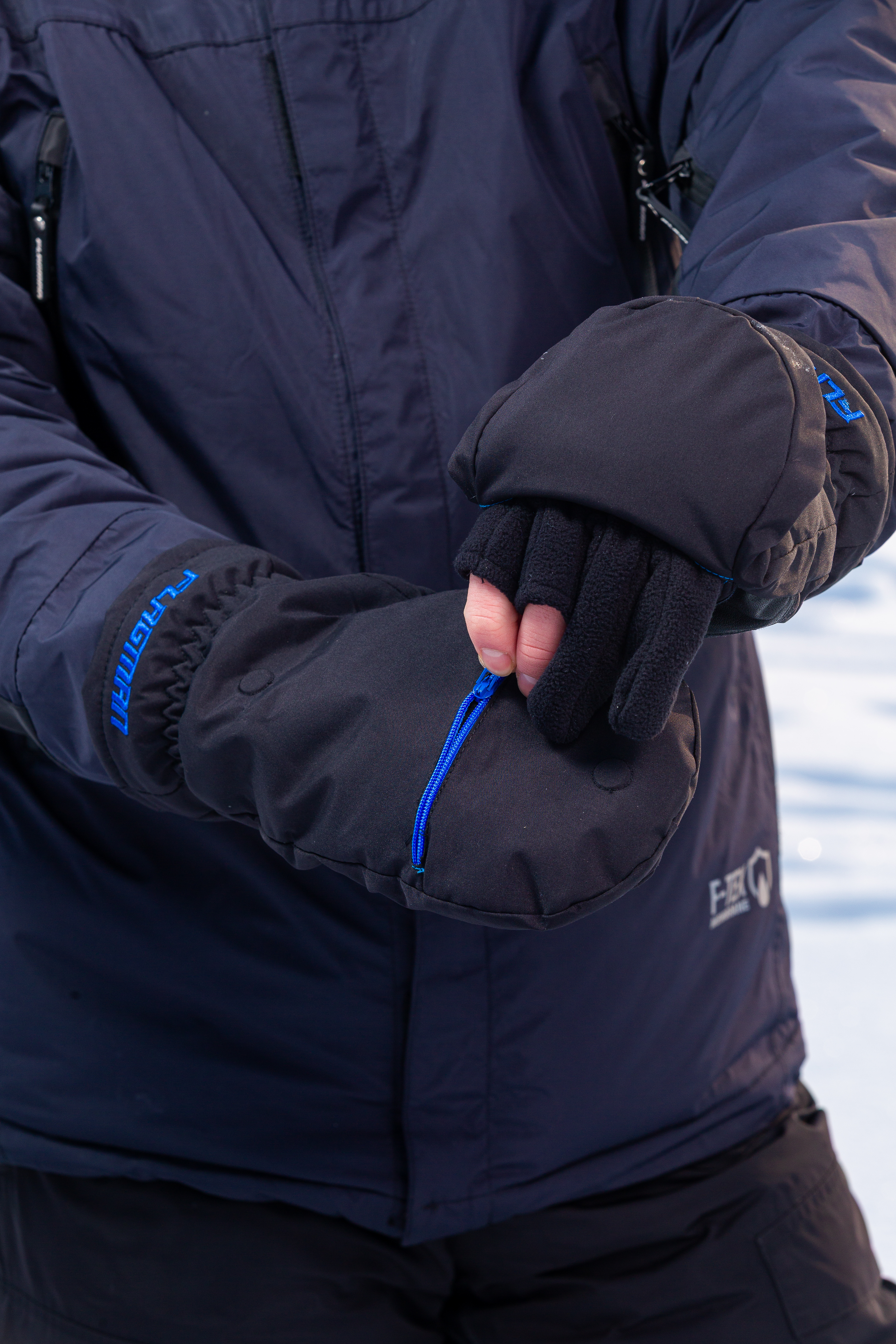 Flagman North River-2 Water Resist – удобные и тёплые водонепроницаемые перчатки-рукавицы для рыбалки, изготовленные из современных технологичных материалов: внешнего слоя полиэстера с DWR пропиткой, слоя синтетического утеплителя Thinsulate, подкладки из мягкого флиса. Рукавицы North River-2 прекрасно сохраняют тепло, защищают от ветра и влаги. Для максимальной свободы действий и удобства манипуляций с рыболовной снастью кончики указательного, среднего и большого пальцев открыты. Чтобы защитить пальцы от холода, перчатки имеют утепленную откидную переднюю часть и откидную часть на большом пальце, что превращает их в полноценные рукавицы. Эти части при необходимости легко и быстро можно откинуть и зафиксировать в таком положении магнитными застежками. На внешней стороне каждой из рукавиц предусмотрены специальные кармашки на молнии для размещения химических грелок, а регулируемые манжеты, хорошо облегающие запястья, предотвращают потери тепла. Прочные, легкие и водонепроницаемые рукавицы Flagman North River-2 Water Resist прекрасно подойдут как для спиннинговой рыбалки в холодное время, так и для рыбалки со льда, охоты или повседневной носки зимой.