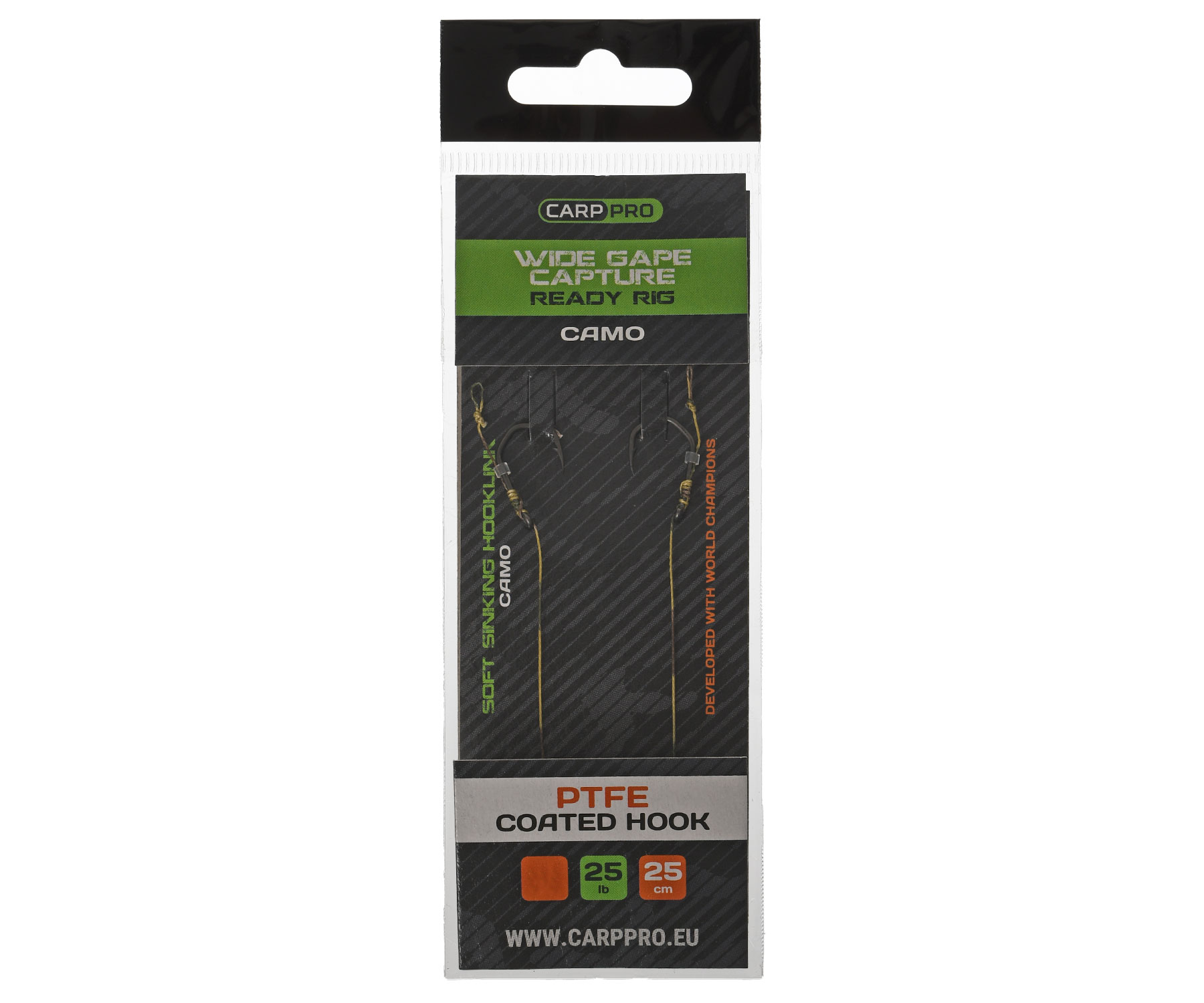 Carp Pro Camo Hooklink 25 см 25lb PTFE Wide Gape Сapture – полностью готовый к использованию карповый поводок, который для более естественной презентации насадки изготовлен из камуфлированного поводкового материала Carp Pro Sinking Hooklink Camo. Это мягкий, тонущий материал, обладающий чрезвычайно высокой прочностью и специальной камуфляжной расцветкой (Camo) в виде плавно чередующихся оттенков зелёного, песочного и коричневого цветов. Данный поводковый материал на дне ведёт себя естественно и при этом идеально маскируется среди растительности, ила, песка и мелких камней. Обладает превосходной прочностью на узлах. Carp Pro Camo Hooklink 25 см 25lb оснащён качественным крючком серии BT – Carp Pro Wide Gape Сapture с черным PTFE (тефлоновым) покрытием, которое не даёт бликов, и агрессивным дизайном для максимальной прочности и борьбы с карпом любого размера. Крючок имеет широкий поддев, короткое цевье, немного загнутые внутрь жало и ушко, а также агрессивный изгиб, который повышает прочность крючка и засекание рыбы. Форма крючка серии Wide Gape Сapture BT прекрасно подходит для презентации как тонущих, медленно тонущих, сбалансированных, так и плавающих насадок любого вида. Ушко крючка на 5˚ загнуто в сторону жала – это значительно улучшает засечение трофея благодаря быстрому развороту крючка во рту рыбы. Длина поводка: 25 см. Разрывная нагрузка: 25 lb.