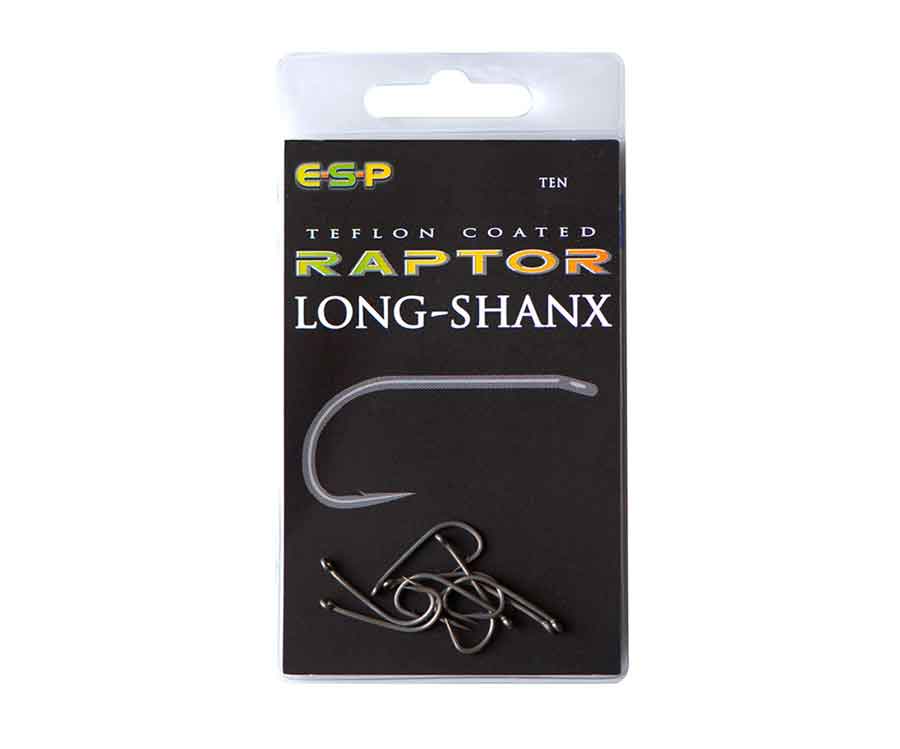 ESP Raptor Long-Shanx — крючки с длинным цевьем, подвержены большей нагрузке, чем стандартные, в них была применена прочная проволока. Покрыты специальным материалом PTFE, который улучшает проникновение и долговечность металла.
