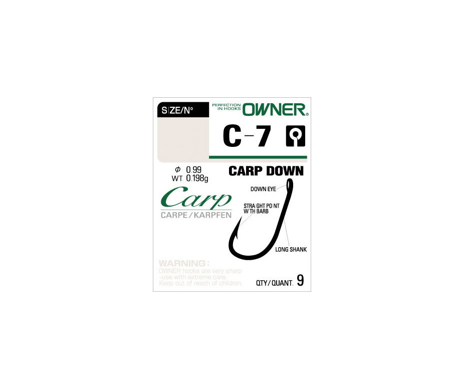 Owner 53267 (С-7) Carp Down – серия мощных и прочных карповых крючков, изготовленных из высококачественной углеродистой стали. Крючки Owner 53267 имеют неширокий загиб, кованый поддев, прямое жало, удлиненное цевье с отогнутым внутрь колечком для привязывания лески и защитное покрытие Black Chrome. Несмотря на то, что крючки Carp Down часто используются для подачи тонущих бойлов, они прекрасно сочетаются и с насадками нейтральной плавучести, и со всплывающими приманками. Отлично подходят для создания разных вариаций монтажа, называемого Blow Back, который с успехом используется опытными карпятниками при ловле осторожных рыб на карповых водоемах с большим рыболовным прессом. Острейшее жало с заточкой Straight Point и зацепистая бородка гарантируют эффективное засечение и надежное удержание клюнувшей рыбы.