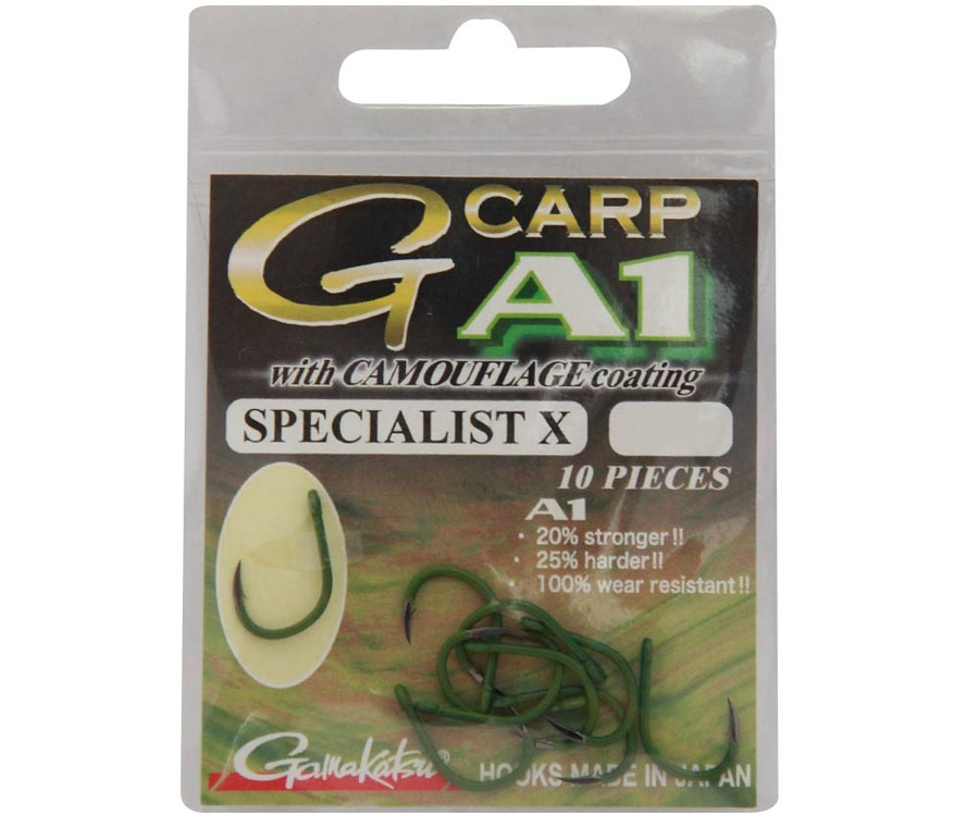 Gamakatsu A1 G-Carp Specialist Camou Green X SP-X – мощный карповый крючок с загнутым внутрь жалом, широким округлым загибом, кованым поддевом и коротким цевьем с колечком. Изготовлен из высококачественной углеродистой стали. G-Carp Specialist Camou Green X SP-X – это усиленная версия крючков G-Carp Specialist. Они отлично подходит для использования в большинстве карповых монтажей и оснасток. Надежная конструкция крючка, острейшей заточки жало и аккуратная бородка обеспечивают отличную засекаемость рыбы, гарантируя успешное удержание и вываживание любого трофея. Крючки A1 G-Carp Specialist Camou Green X имеют защитное камуфляжное покрытие в зеленых тонах.