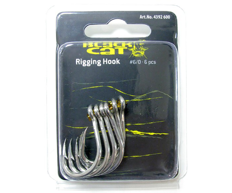 Black Cat Rigging Hook — невероятно прочный и острый сомовый крючок. Вдобавок отличается кованным цевьем, цельнокруглым ушком и слегка загнутым внутрь жалом. Идеален для насадки пучка червей. Выпускается в размерах #4/0, #6/0 и #8/0. В упаковке 6 шт.