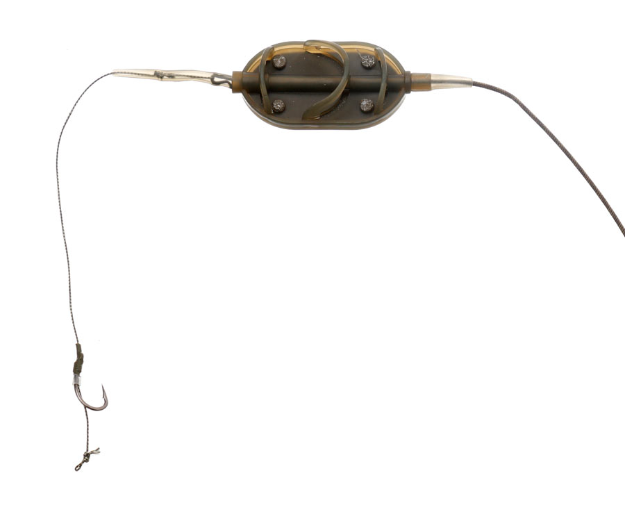 Готовая к работе карповая оснастка «Flat Method Feeder Rig», монтируется на ледкоре Climax (Germany) 35–45 lb, крючок – Kumho (Korea), поводковый материал – Climax (Germany) 25 lb. Кормушка всегда падает на дно грузилом вниз, а прикормкой вверх. Монтаж с глухой фиксацией кормушки при поклевке способствует самоподсечке рыбы. Поводок используется с волосяным креплением насадки.