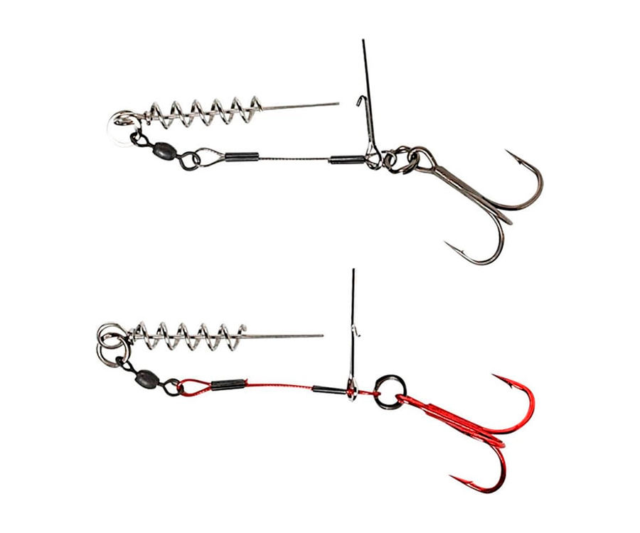 Эта оснастка Savage Gear Carbon49 Corkscrew Stinger имеет специальный штопор для надёжного крепления носовой части приманки и один тройной крючок. В упаковке 2 оснастки: одна с темным крючком, другая – с красным.