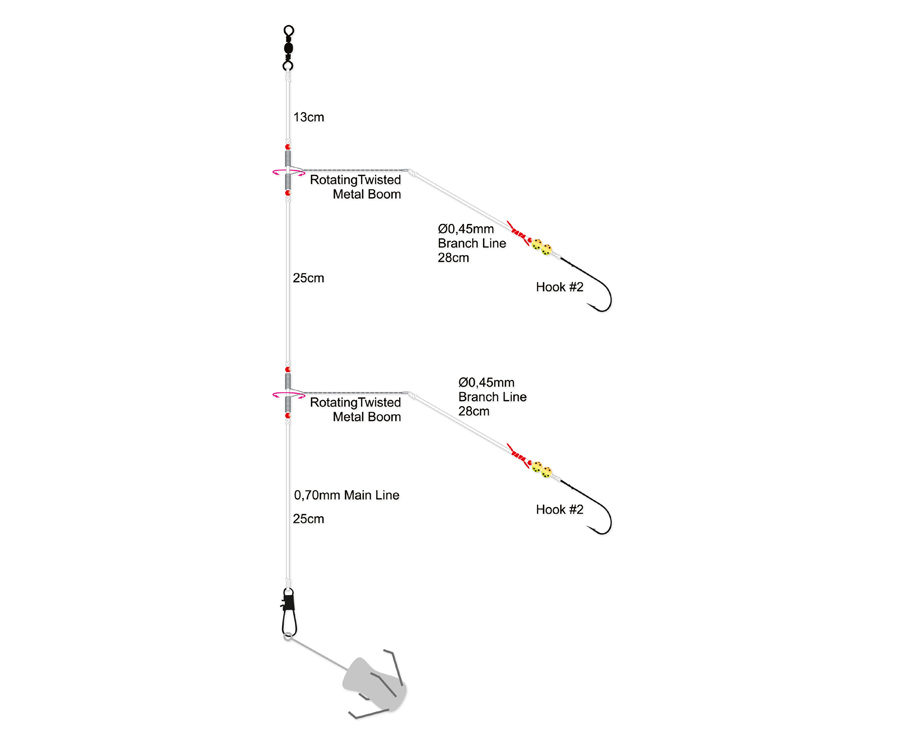 Spro 2HK M-Boom Flatfish Paternoster — морская оснастка типа патерностер, выполненная на трех боковых поводках. Готовый монтаж предназначен для ловли камбалы любых видов. За счет большой длины монтажа (110 см) увеличивается площадь облова и шанс поимки рыбы. Рабочими элементами монтажа выступают три пружинящих металлических поводка с одинарными крючками, на которые насаживается крабовое мясо или куски рыбы. Диаметр основной лески — 0,7 мм. Диаметр лески на поводках — 0,3 мм. Размеры крючков отличаются в зависимости от номера монтажа — 2, 4 или 6. Размер крючка, длина и диаметр лески указаны производителем на упаковке.