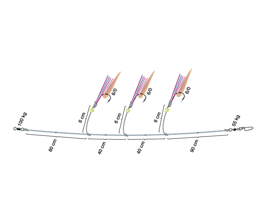 SPRO Norway Dorsch Flasher 1 — мощная морская оснастка с вертлюгами, рассчитанная на лов хищной рыбы у самого дна (крупной трески, камбалы, скумбрии), на глубинах до 60 м. Оснащена тремя острейшими крючками 6/0 и тремя яркими силиконовыми насадками, имитирующими личинку с хвостом. Однако эта оснастка обладает еще и уникальными флуоресцентными элементами. Благодаря специальному UV-покрытию, трубки и бусины в составе SPRO Norway Dorsch Flasher 1 на больших глубинах, даже при недостаточном освещении, эффективно подманивают хищную рыбу. Длина системы — 250 см. Диаметр шнура — 0,9 мм.