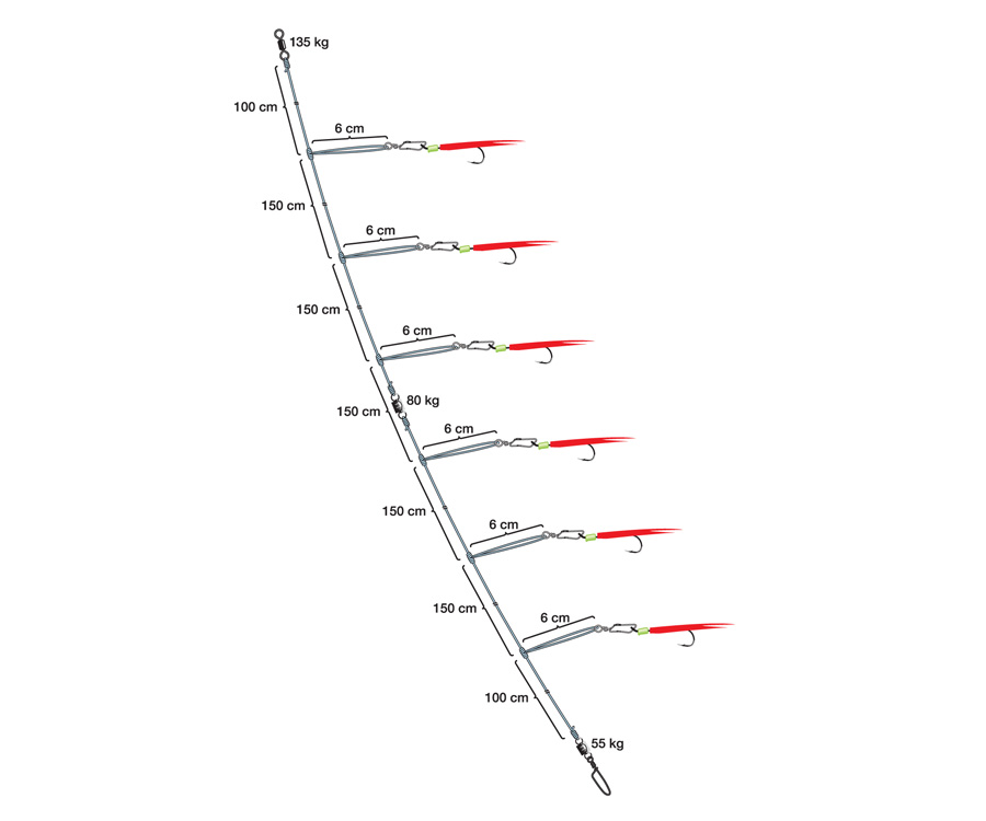 Оснастка морская SPRO Norway Red Fish Rig 5 — готовый монтаж для ловли морской рыбы. Чаще всего применяется для ловли крупного морского окуня на разных глубинах. Эта оригинальная морская оснастка выполненная в виде комбинации флуоресцентных бусинок, красных твистеров в форме личинок осьминога с крючками 7/0. Причем, карабин с петлей на конце поводка позволяет быстро менять крючки при необходимости.