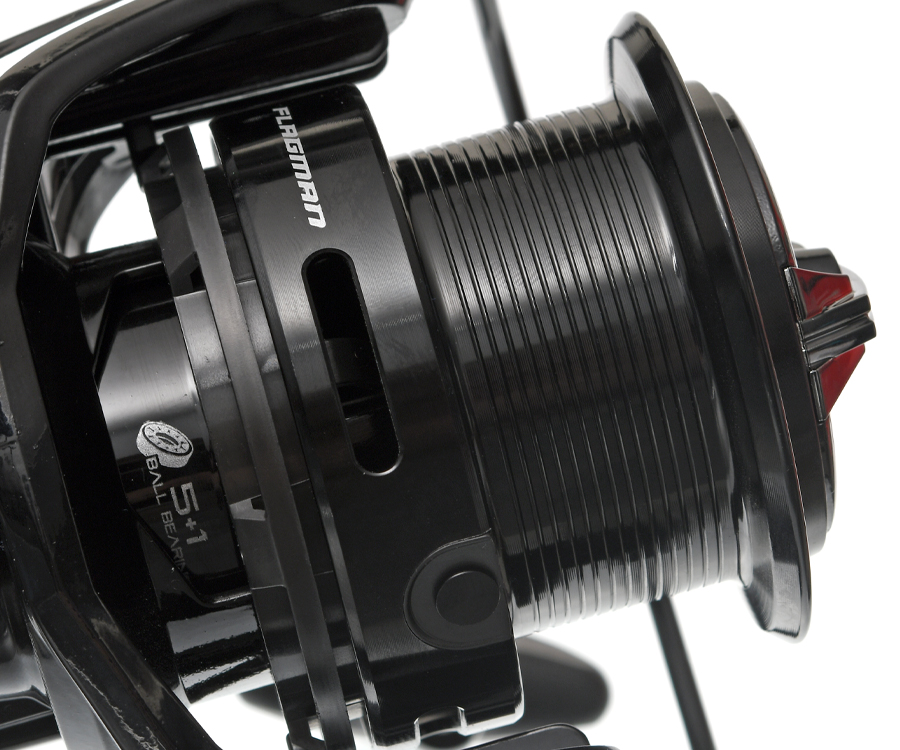 Flagman Squadron Flow Feeder – новинка сезона, серия высококлассных катушек, специально разработанных для фидерной ловли трофейной рыбы на течении и больших дистанциях. Все модели Squadron Flow Feeder обладают высокими тяговыми характеристиками и прекрасно подойдут для фидерной ловли на течении в сложных условиях с использованием тяжёлых и даже сверхтяжёлых кормушек. Их корпус и ротор изготовлены из высокопрочного пластика. Благодаря мощной главной паре, выполненной из качественных сплавов, пониженной редукции 4,6:1 и высококачественным подшипникам, установленным в самых необходимых точках механизма, эти катушки обладают не только повышенной мощностью, но и значительным ресурсом. Надёжный механизм с бесконечным винтом Wormshaft System гарантирует качественную укладку лески, а устойчивый к истиранию ролик лесоукладывателя системы Anti-Twist предотвращает её перекручивание. Ёмкость облегчённой алюминиевой шпули Flagman Squadron Flow Feeder оптимизирована для работы с тонкими современными лесками и шнурами. Шпуля оснащена круглой подпружиненной металлической клипсой, которая делает фиксацию дистанции ловли надёжной и безопасной как для лески, так и для шнура. Конический V-образный буртик шпули значительно уменьшает трение при вылете лески, что также повышает дальность забросов. Фрикцион обладает быстрой регулировкой и отличается стабильной работой. Силовая алюминиевая ручка напрямую вкручивается в главную пару, исключая любые люфты. Она имеет удобный обрезиненный Т-образный кноб, который обеспечивает надёжный и уверенный хват при работе с катушкой. Новые катушки Flagman Squadron Flow Feeder – это мощный и надёжный инструмент для ценителей фидерной ловли, выполненный в стильном черном дизайне.