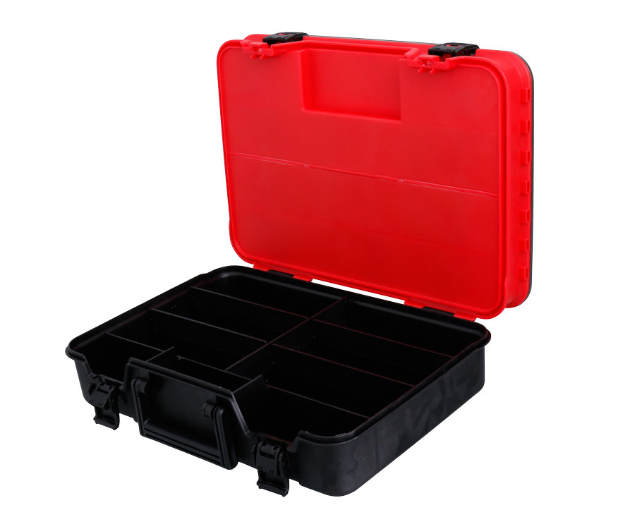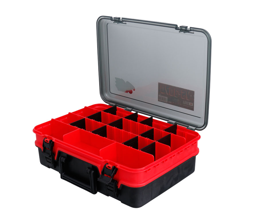 Рыболовный кейс с двумя отделениями. Верхнее отделение служит своего рода коробкой с системой фиксированных и съемных перегородок, позволяющей самостоятельно формировать внутреннее пространство. Прозрачная крышка с надежным шарниром имеет два надежных фиксатора. Нижнее отделение большого размера оборудовано системой фиксированных и съемных перегородок. Оно оптимизировано для хранения крупных приманок, а также инструмента, небольших коробок и т. д. Кейс оборудован ручкой для переноски.