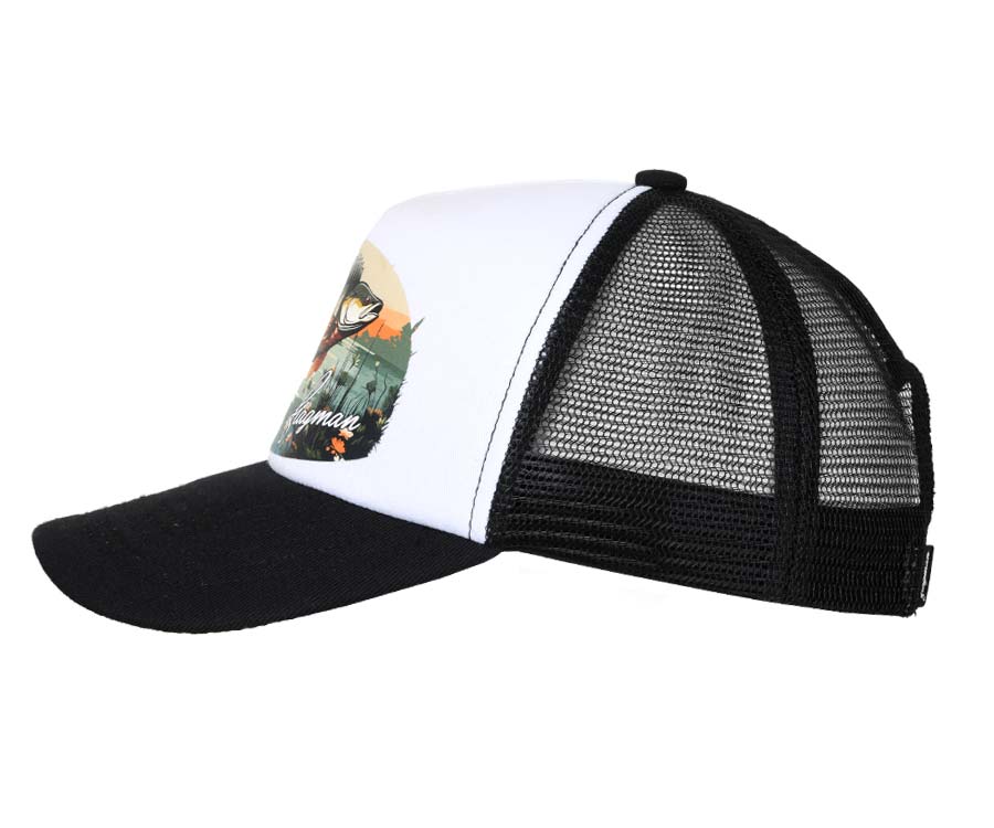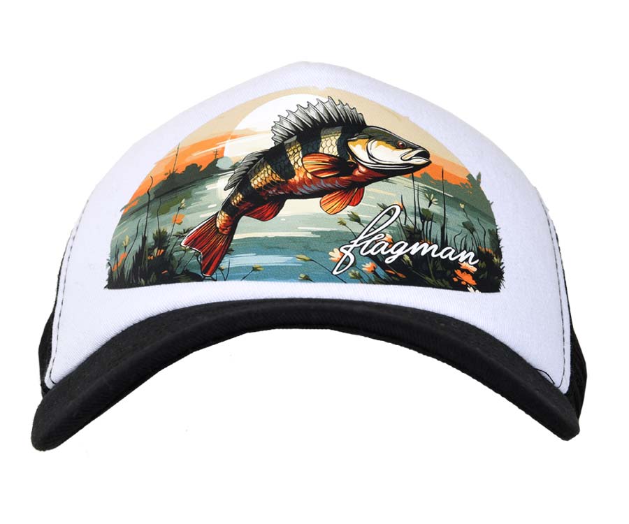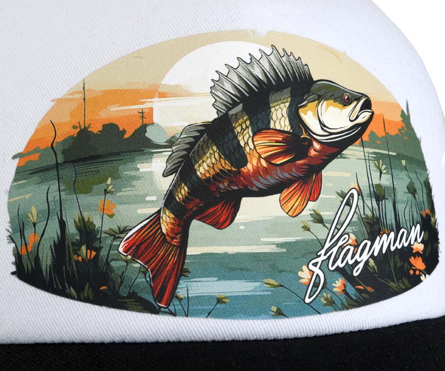 Flagman Trucker Cap – стильная лёгкая бейсболка бело-черного цвета с ярким красочным изображением рыбы – окуня, карпа, плотвы и т.п. – в её среде обитания. Кепка Flagman Trucker не только подчеркнет вашу индивидуальность, но и позволит чувствовать себя комфортно в жаркую погоду. Она выполнена из прочных и лёгких материалов. Для лучшей вентиляции в затылочной части изделия используется сетчатая ткань. Кепка оснащена большим жестким козырьком и удобной застёжкой сзади для регулировки размера. Идеально подойдёт как для рыбалки, так и для кемпинга, дачи или повседневной носки в теплое время года.