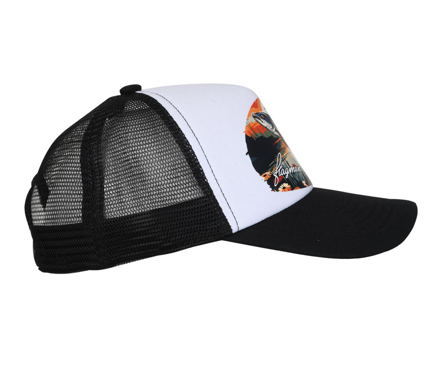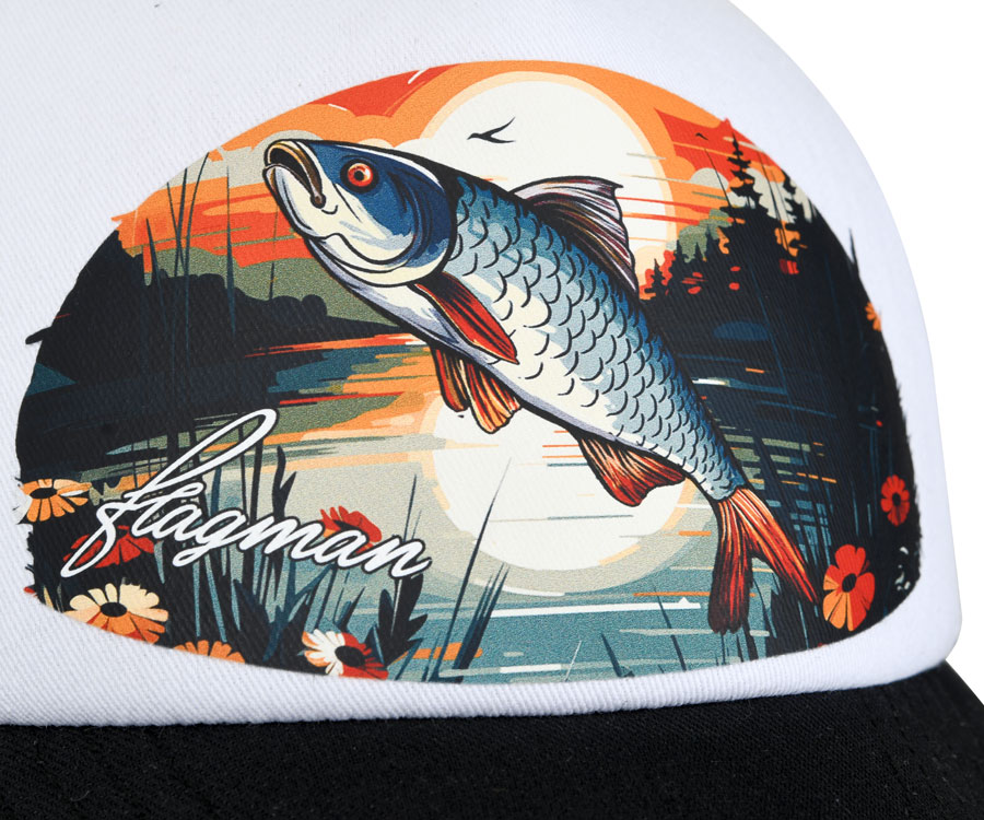 Flagman Trucker Cap – стильная лёгкая бейсболка бело-черного цвета с ярким красочным изображением рыбы – окуня, карпа, плотвы и т.п. – в её среде обитания. Кепка Flagman Trucker не только подчеркнет вашу индивидуальность, но и позволит чувствовать себя комфортно в жаркую погоду. Она выполнена из прочных и лёгких материалов. Для лучшей вентиляции в затылочной части изделия используется сетчатая ткань. Кепка оснащена большим жестким козырьком и удобной застёжкой сзади для регулировки размера. Идеально подойдёт как для рыбалки, так и для кемпинга, дачи или повседневной носки в теплое время года.