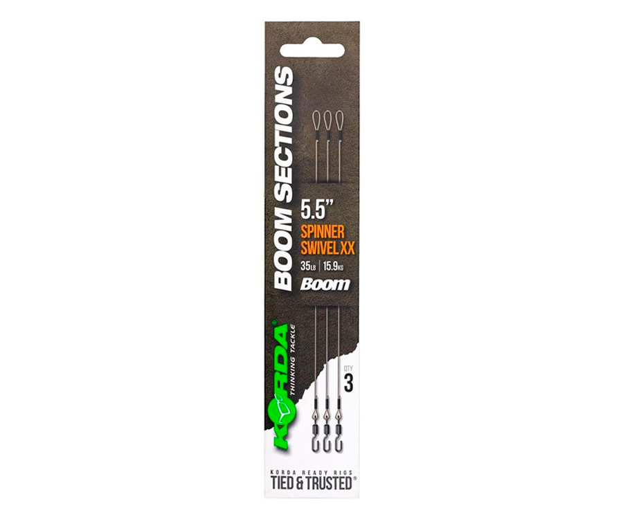 Оснастка Spinner Rig невероятно популярна в наши дни, но если вы не уверены в том, что сможете изготовить её самостоятельно, или просто у вас нет времени, то эти готовые оснастки Korda Booms Spinner Swivel XX – идеальное решение. Они изготовлены из лучшего материала. Отводы с разрывной нагрузкой до 35 фунтов (15.8 кг). Готовые оснастки Korda Booms Spinner Swivel XX чрезвычайно прочные и долговечные. На одном конце у них есть обжатая петля, которую можно прикрепить к вашей снасти с помощью вертлюжка QC, Kwik Link или аналогичного. С другой стороны, вертлюг с быстросъёмом Spinner XX прикреплённый на обжатую петлю. Отводы с быстросъемным вертлюгом Korda Booms Spinner Swivel XX выпускаются длиной 5,5 (14 см) или 7,5 дюймов (19 см), по три штуки в упаковке.