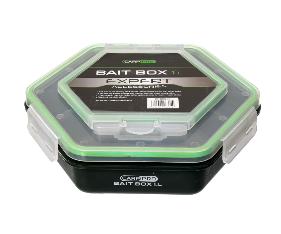 Коробки Carp Pro Bait Box – удобные и функциональные боксы, предназначенные для герметичного хранения стик- и метод-миксов, готовых стиков, а также приманок для ловли карпа. Carp Pro Bait Box изготовлены из прочного пластика. Основная крышка каждой модели Carp Pro Bait Box оборудована дополнительной крышкой меньшего размера – для быстрого доступа к содержимому. Крышки оснащены резиновыми прокладками, обеспечивающими герметичность изделия и предотвращающими проникновение воды, пыли и посторонних запахов. В серии доступны модели ёмкостью 1, 1,5 и 2 литра.