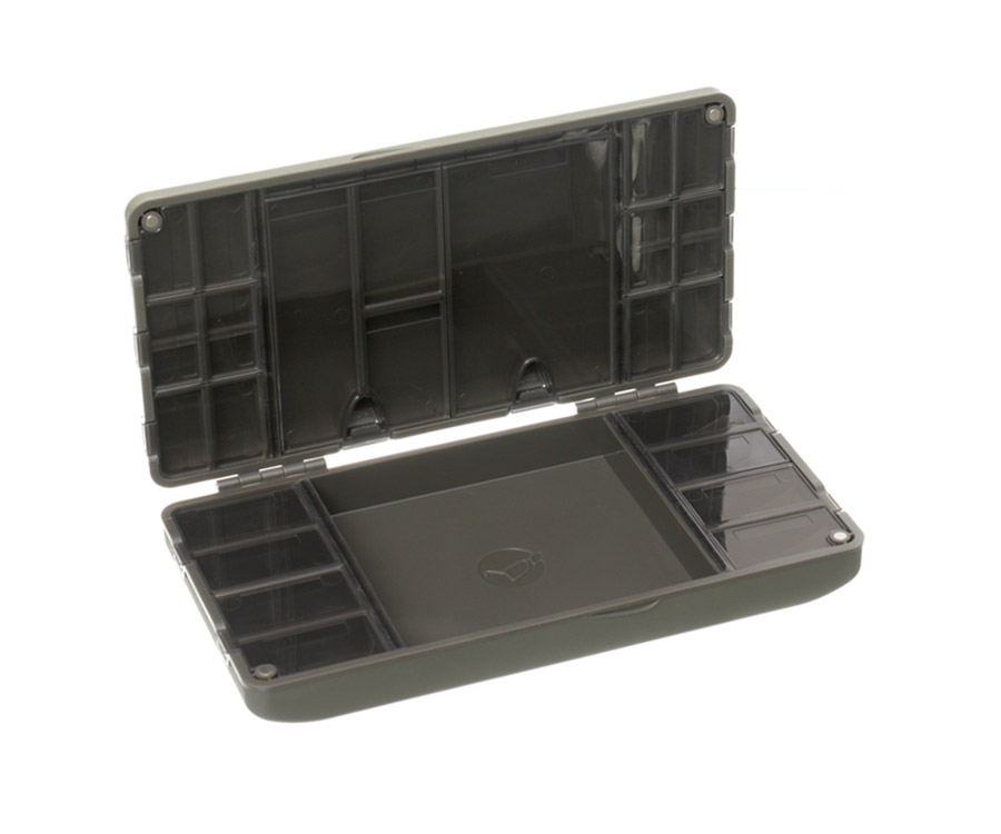 Коробка TackleSafe — это складываемый из двух половинок футляр с магнитным замком для хранения снастей. Ее особенности — конструкция из жесткого пластика, нескользящая мягкая на ощупь шероховатая поверхность и линейка в роли вспомогательного элемента для вязания оснасток. На одной половине кейса расположено открытое отделение, которое можно использовать для хранения, например, катушек с поводковым материалом, инструментов для затягивания оснасток Pulla Rig Tool, ножниц и т.п. Здесь же размещены восемь отсеков для разных мелочей: бусин, клипс для грузил, искусственных насадок. Отсеки оборудованы откидными крышками, которые предотвращают случайное выпадение предметов. На второй половине футляра есть два больших отделения с крышками, где можно держать пакеты с крючками, иглы для насадок и пр. Тут также есть несколько небольших отделений с крышечками для вертлюгов, колечек, термоусадочных трубок, лентяек и прочих мелких элементов оснастки.