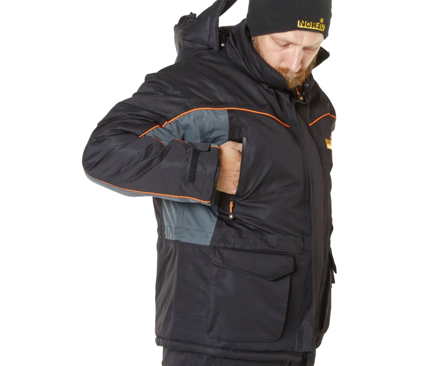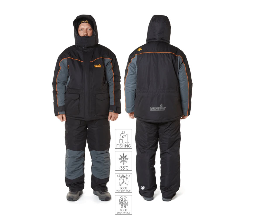 Универсальный функциональный теплый костюм. Эксплуатация до температуры –35ᵒC. Мембранная ткань. Проклеенные швы. Куртка: двухзамковая застежка-молния с клапаном на «липучке», капюшон с козырьком, двухуровневая регулировка капюшона, высокий воротник с флисовой подкладкой, регулировка объема куртки в области талии, утепленные карманы для согрева рук с влагозащитными застежками-молниями, удобные карманы снаружи, светоотражающие элементы безопасности, манжеты на рукавах: внутренние эластичные, наружные- регулируемые. Полукомбинезон: двухзамковая застежка-молния с клапаном на «липучке», регулируемые по длине лямки с замками, мягкие вставки на коленях и съемная мягкая вставка на седалище, два накладных кармана, шлевки под ремень, застежка-молния снизу штанов с клапаном на «липучке».