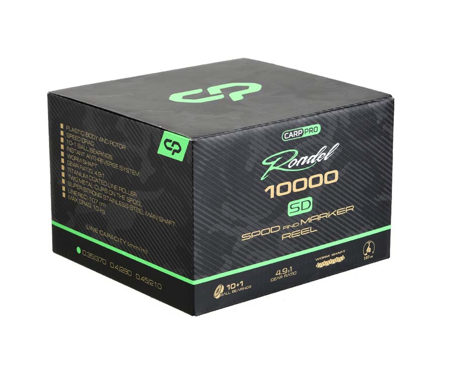 Carp Pro Rondel 10000 SD – новинка 2023 года! Обновлённая серия карповых катушек топ-класса Carp Pro Rondel предназначена для ловли трофейной рыбы на максимальных дистанциях. Катушки CP Rondel новой генерации надёжные, эффективные и удобные в работе! В конструкции Carp Pro Rondel 10000 SD все подчинено идее выполнения дальних и сверхдальних забросов. Бесконечный винт, который обеспечивает идеальную укладку лески на шпулю вытянутой формы с геометрией Long Cast, имеет малый шаг, благодаря чему шпуля совершает при вращении ротора очень медленные возвратно-поступательные движения. Леска ложится на шпулю виток к витку, что обеспечивает аккуратную и плотную укладку, а, значит, – минимальное трение при забросе. Механизм катушек Carp Pro Rondel обладает высокой прочностью и внушительными тяговыми характеристиками. Сверхпрочная ось с лёгкостью выдерживает значительные нагрузки, возникающие при вываживании трофеев. Надёжная алюминиевая ручка приобрела новый обрезиненный аэрокноб меньшего размера, более удобный в работе. Ролик лесоукладывателя конструкции Anti-Twist имеет покрытие из нитрида титана, которое предотвращает его пропиливание при работе со шнурами. Быстрый фрикцион Speed Drag с мощными дисками отличается высокой стабильностью работы и не подведёт в самый ответственный момент. Carp Pro Rondel – это надёжный рабочий инструмент для охотников за трофеями!