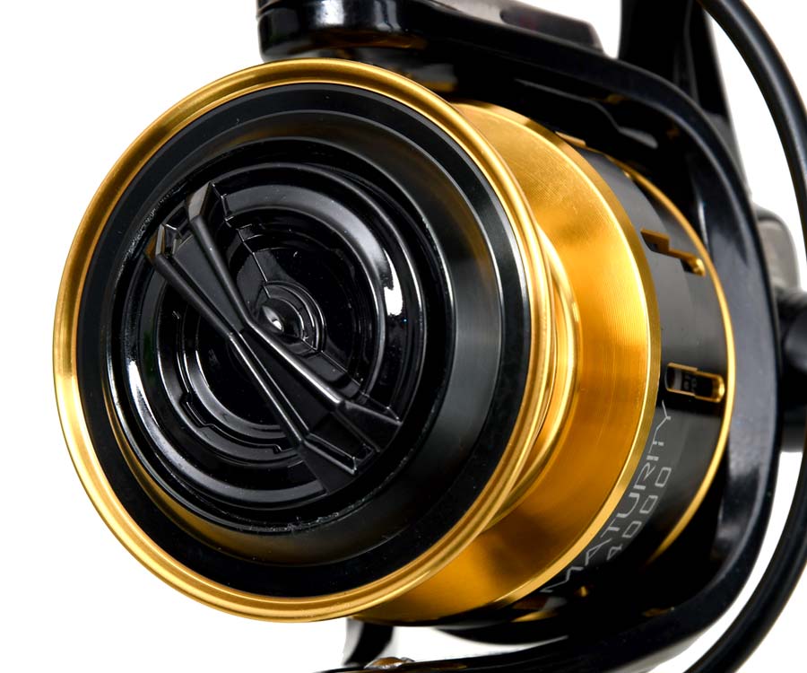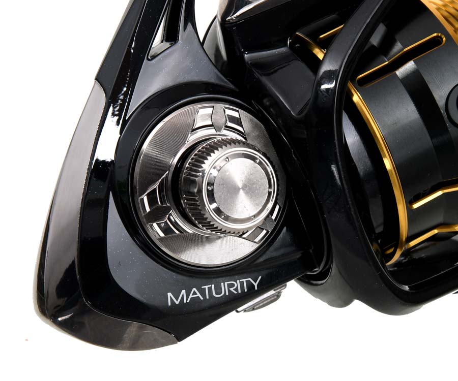Ryobi Maturity – серия безынерционных катушек, выполненная в золотисто-черных тонах, которая сочетает в себе стильный дизайн и невысокий ценник. Элементы корпуса выполнены из алюминия, а сам корпус и V-образный ротор изготавливаются из высокопрочного и легкого композитного материала NCRT. Облегченная перфорированная шпуля из алюминия имеет скошенный буртик, обеспечивающий максимально легкий сход лески, а, следовательно, максимально дальний заброс приманки. Передний фрикционный тормоз с возможностью тонкой настройки оснащен увеличенными дисками, защищен от воды и грязи специальной эластичной резиновой прокладкой. Отличительной чертой серии Maturity 4000 от Ryobi является мягкий и плавный ход механизма, обеспечиваемый высококачественными шарикоподшипниками из нержавеющей стали.