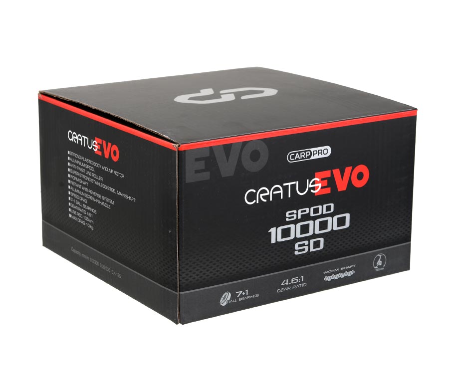 Carp Pro Cratus Evo Spod 10000 SD – новинка 2024 года, мощная и надёжная сподовая катушка нового поколения, которая предназначена к использованию с прикормочными удилищами Spod Rod для прикармливания места ловли. Модель Cratus Evo Spod 10000 SD будет великолепным дополнением к одноименной серии карповых удилищ Carp Pro Cratus Evo. Она изготовлена в жёстком корпусе из высокопрочного пластика, оснащена мощным тяговым механизмом с червячной передачей и быстрым фрикционным тормозом Speed Drag. Вместительная алюминиевая шпуля с конической формой буртика способствует снижению трения лески и заметно повышает дальность заброса. Качественная укладка лески достигается использованием бесконечного винта. Под шпулей Carp Pro Cratus Evo Spod 10000 SD расположено специальное пластиковое кольцо, предотвращающее попадание лески под шпулю и наматывание её на ось. К достоинствам новых катушек Cratus Evo Spod 10000 SD стоит также отнести алюминиевую ручку, которая вкручивается в главную пару, минимизируя люфты в этом узле, сверхпрочную ось из нержавеющей стали, ролик лесоукладывателя с покрытием из нитрида титана и системой Anti-Twist, исключающий перекручивание лески, мгновенный стопор обратного хода, повышенное количество лески, наматываемой за один оборот ручки, круглую металлическую клипсу, а также быстрый фрикцион, который отличается высокой стабильностью работы. Катушка Carp Pro Cratus Evo Spod 10000 SD – это надёжный рабочий инструмент для охотников на трофейную рыбу, который выполнен в стильном черном цвете с красными элементами дизайна и идеально сочетается с одноименной серией карповых удилищ Cratus Evo!