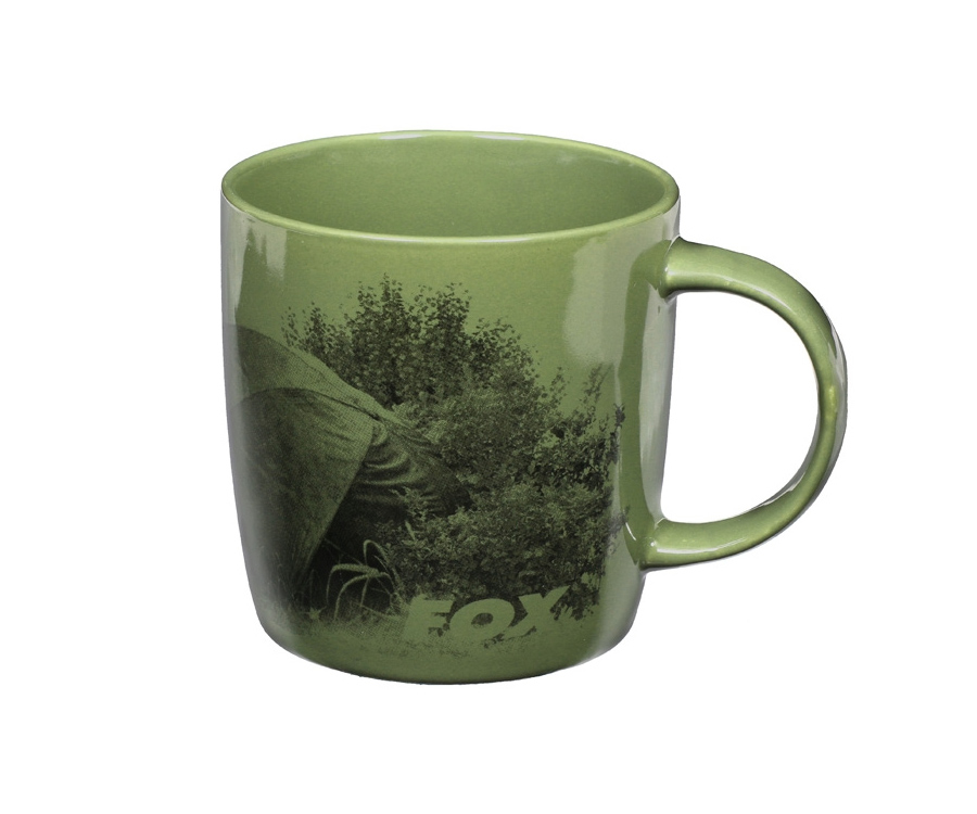 Керамическая кружка зеленого цвета с принтом подставки под карп и логотипом Fox. Широкая, устойчивая, идеально подходит для утреннего кофе или послеобеденного чая.